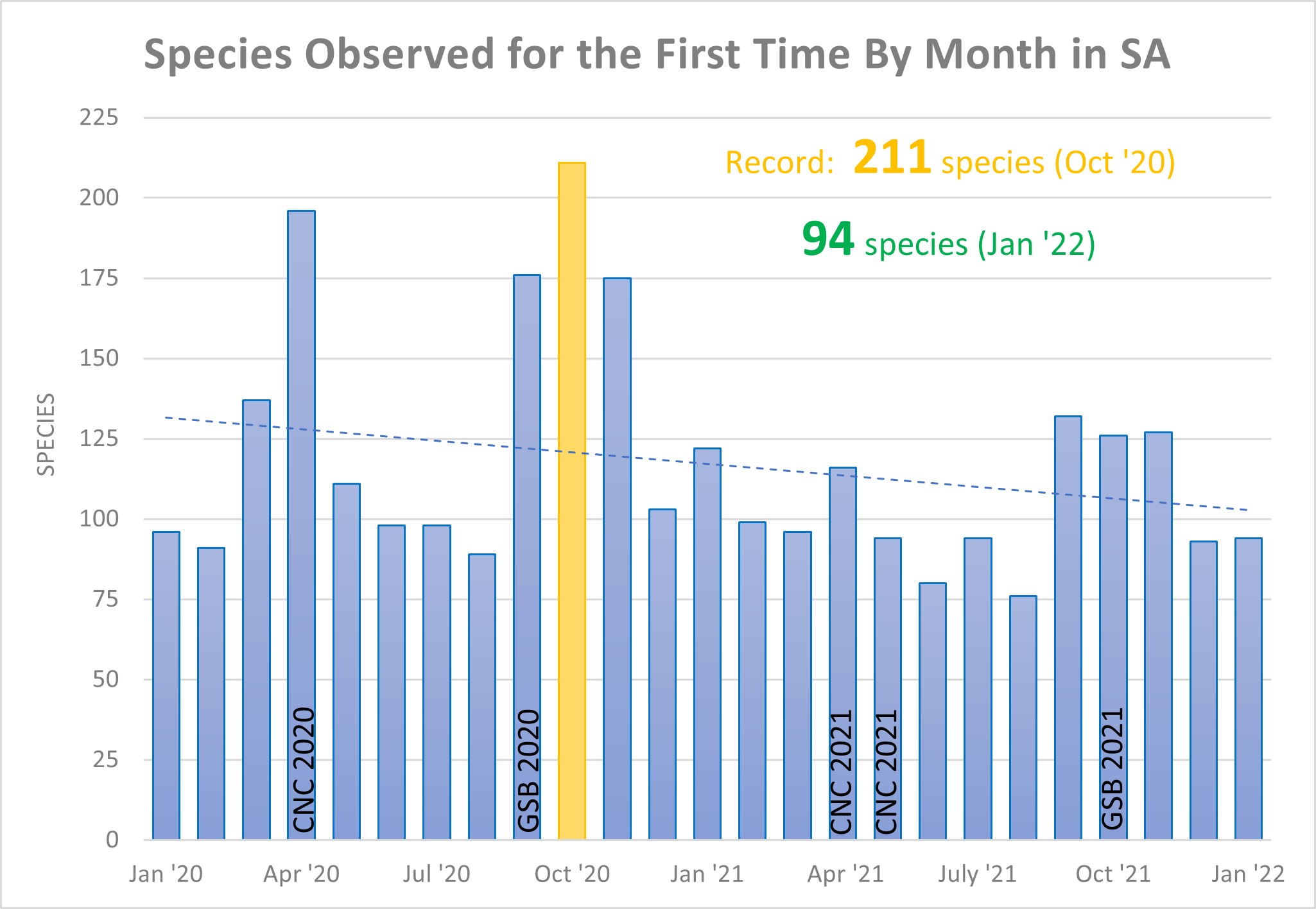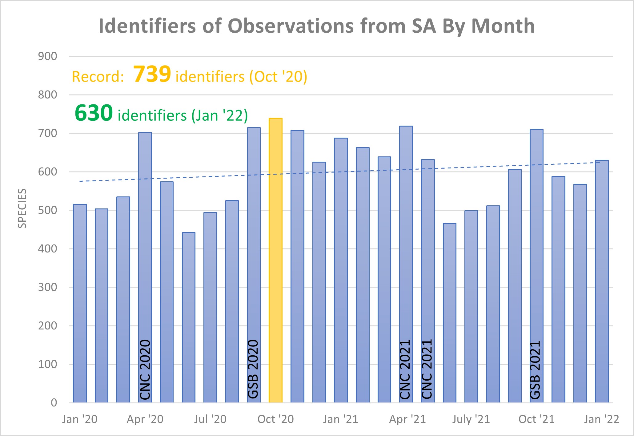 This January saw 8,720 observations covering 1,955 species from a total of 507 observers. There were 94 species receiving their first iNat record in SA. This month there were 103 new observers contributing their first observations in SA. Upon this months observations, 631 identifiers contributed a total of 15,385 identifications.