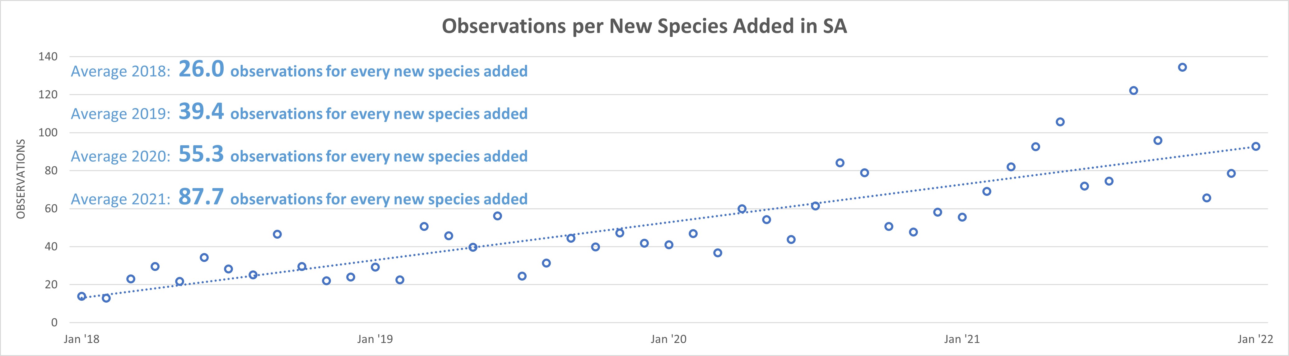 Uploads for SA at the end of January stand at 289,846 observations of 8,706 species from 4,124 observers with, as of today, 4,688 identifiers providing 527,932 identifications.