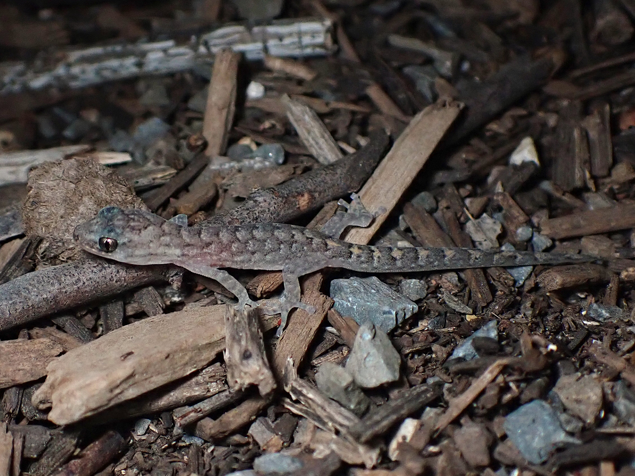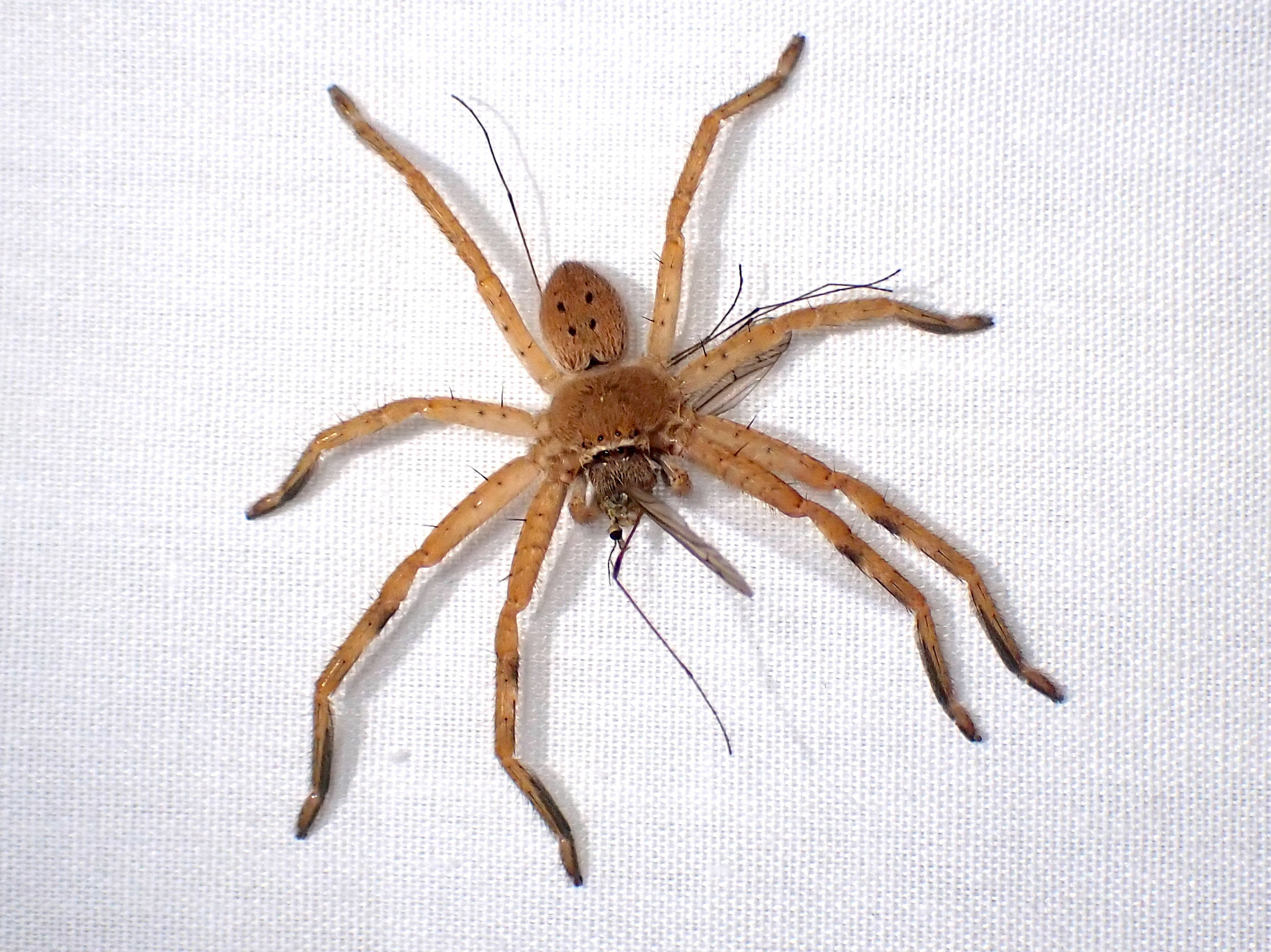 Having the sheet mounted to a shed wall means easy access to a feast for flightless predators. This Isopedella leai (Cinnamon Huntsman) made its way onto the sheet and partook in a Crane Fly meal. A young Christinus marmoratus (Southern Marbled Gecko) took advantage of any Insects dropping to the ground, but the adults which frequently visit were absent.