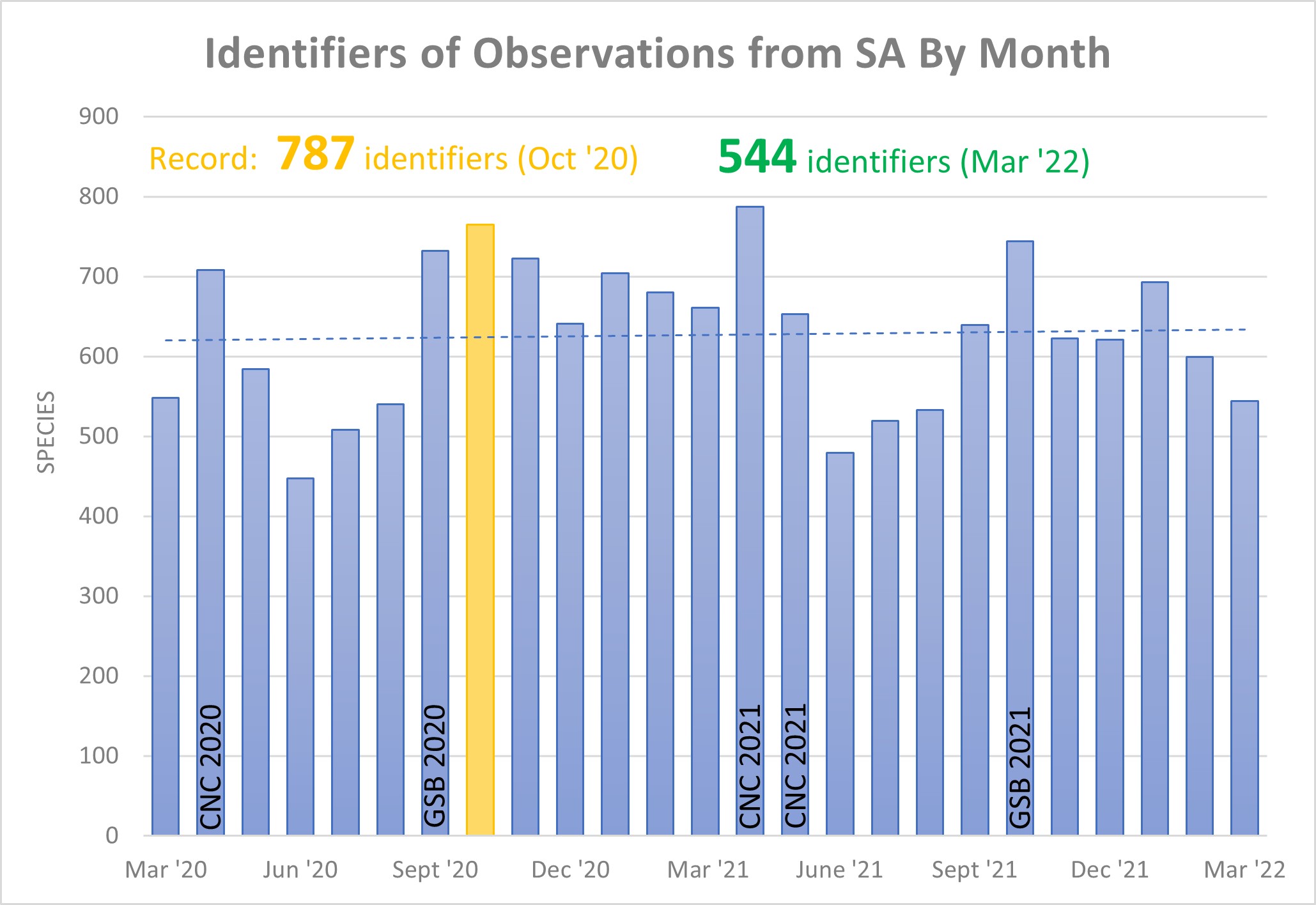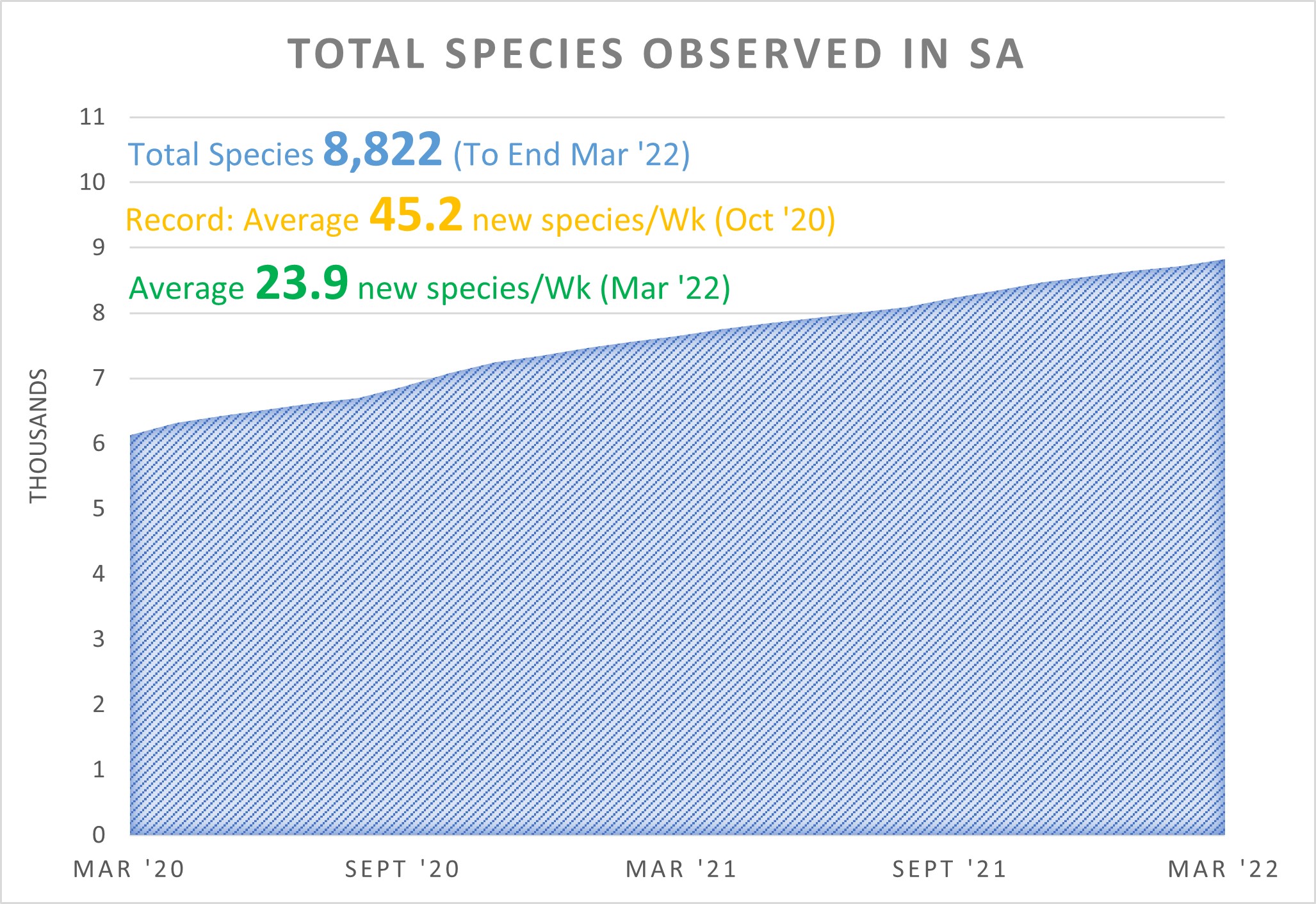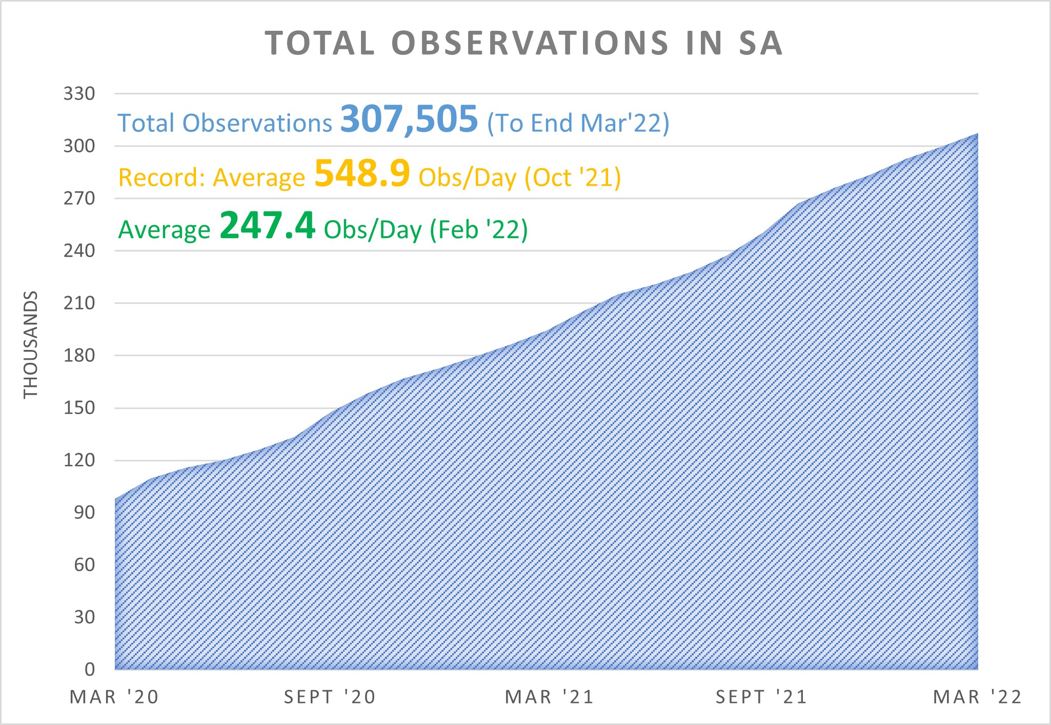 Uploads for SA at the end of March stand at 307,505 observations of 8,822 species from 4,344 observers with, as of today, 4,957 identifiers providing 561,989 identifications.