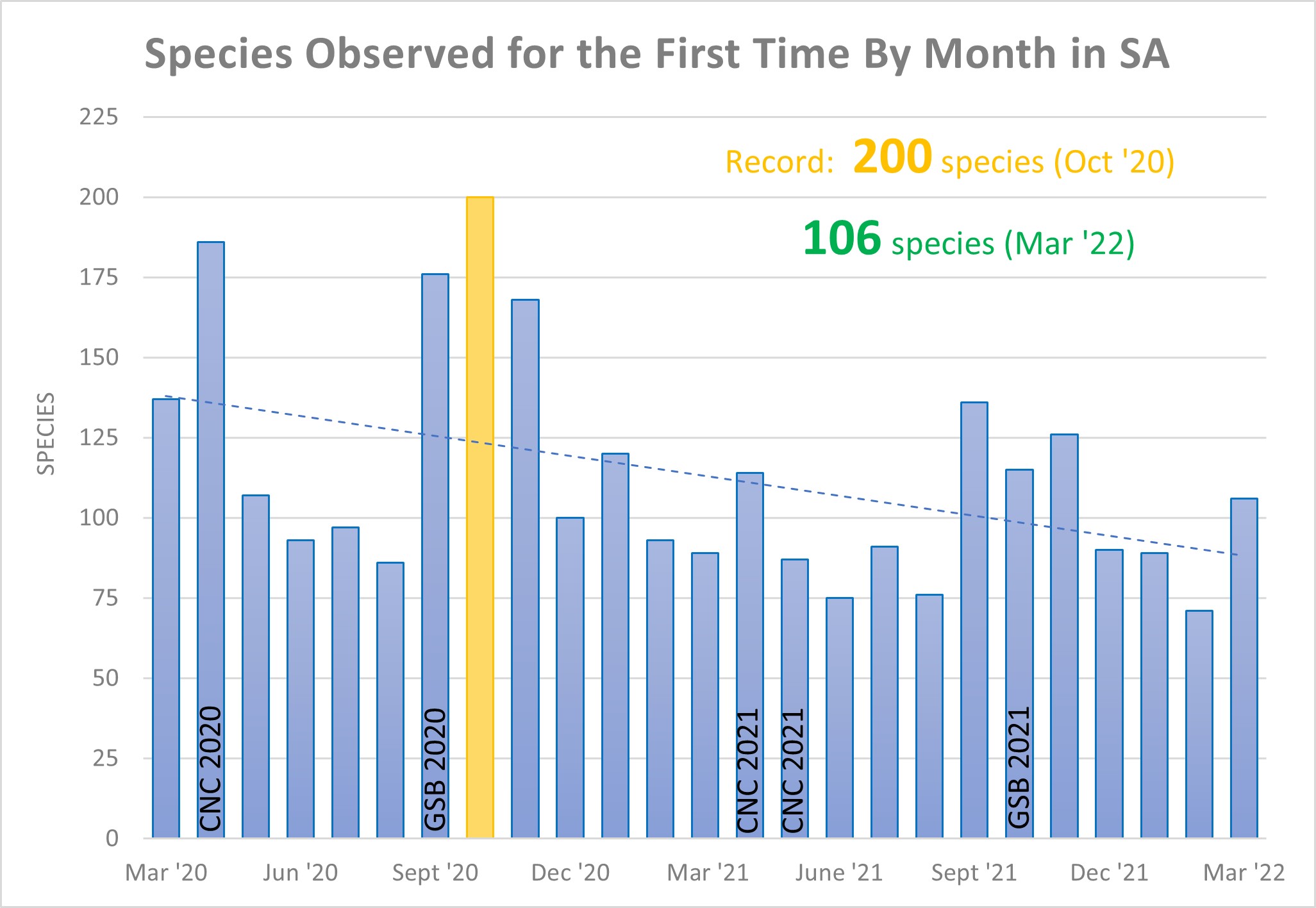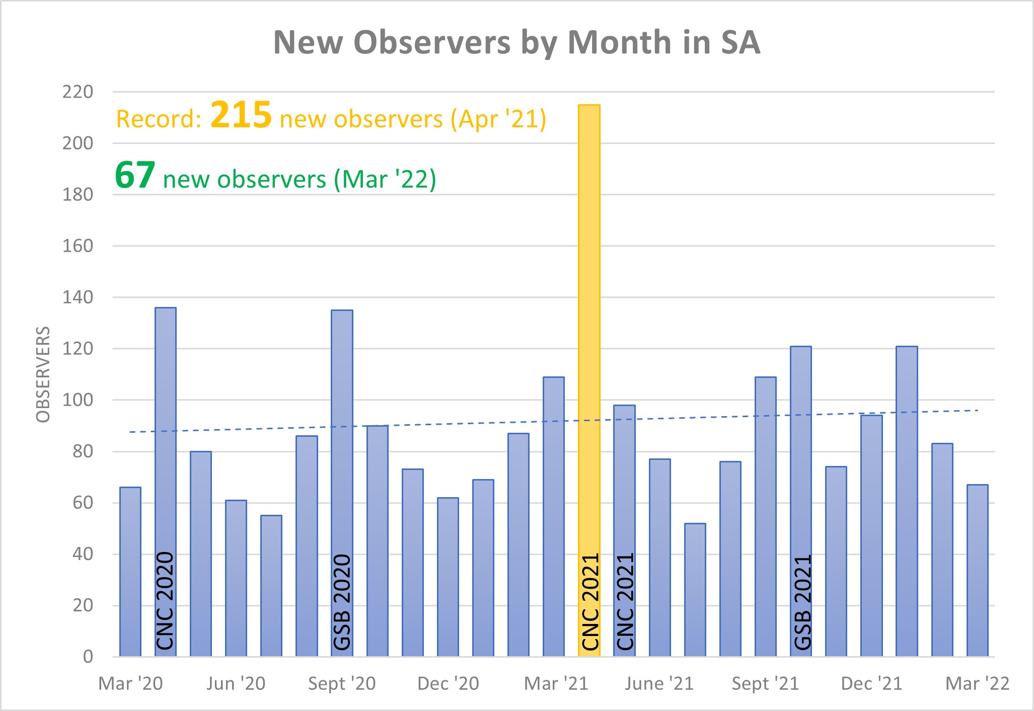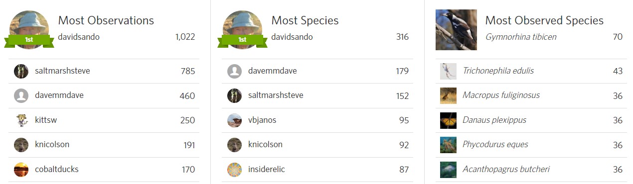 This March saw 7,670 observations covering 1,914 species from a total of 488 observers. There were 106 species receiving their first iNat record in SA. This month there were 67 new observers contributing their first observations in SA. Upon this months observations, 544 identifiers contributed a total of 13,326 identifications.