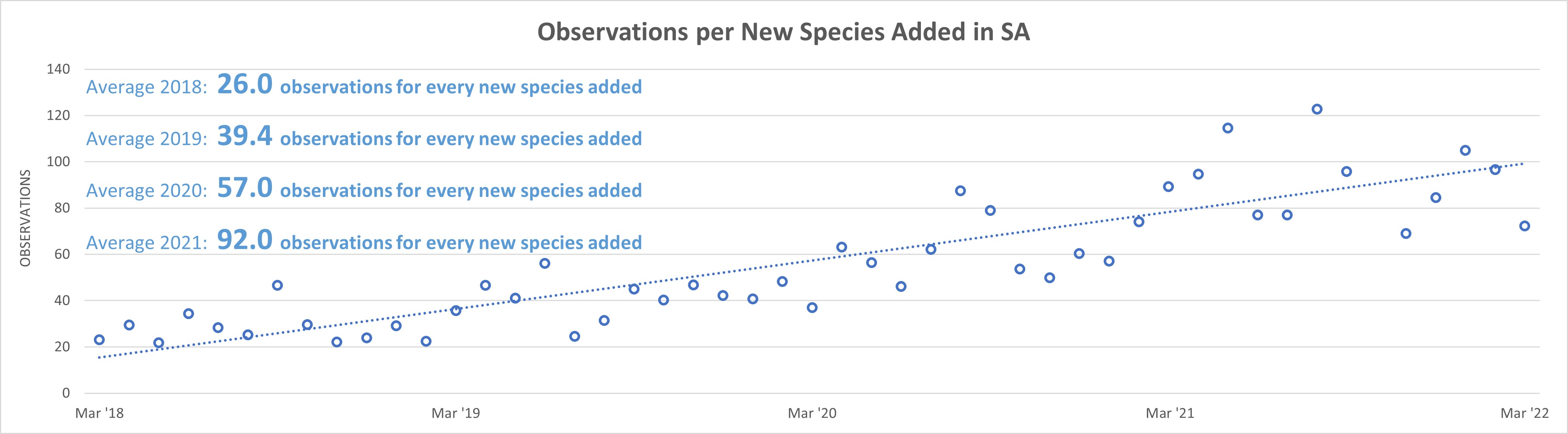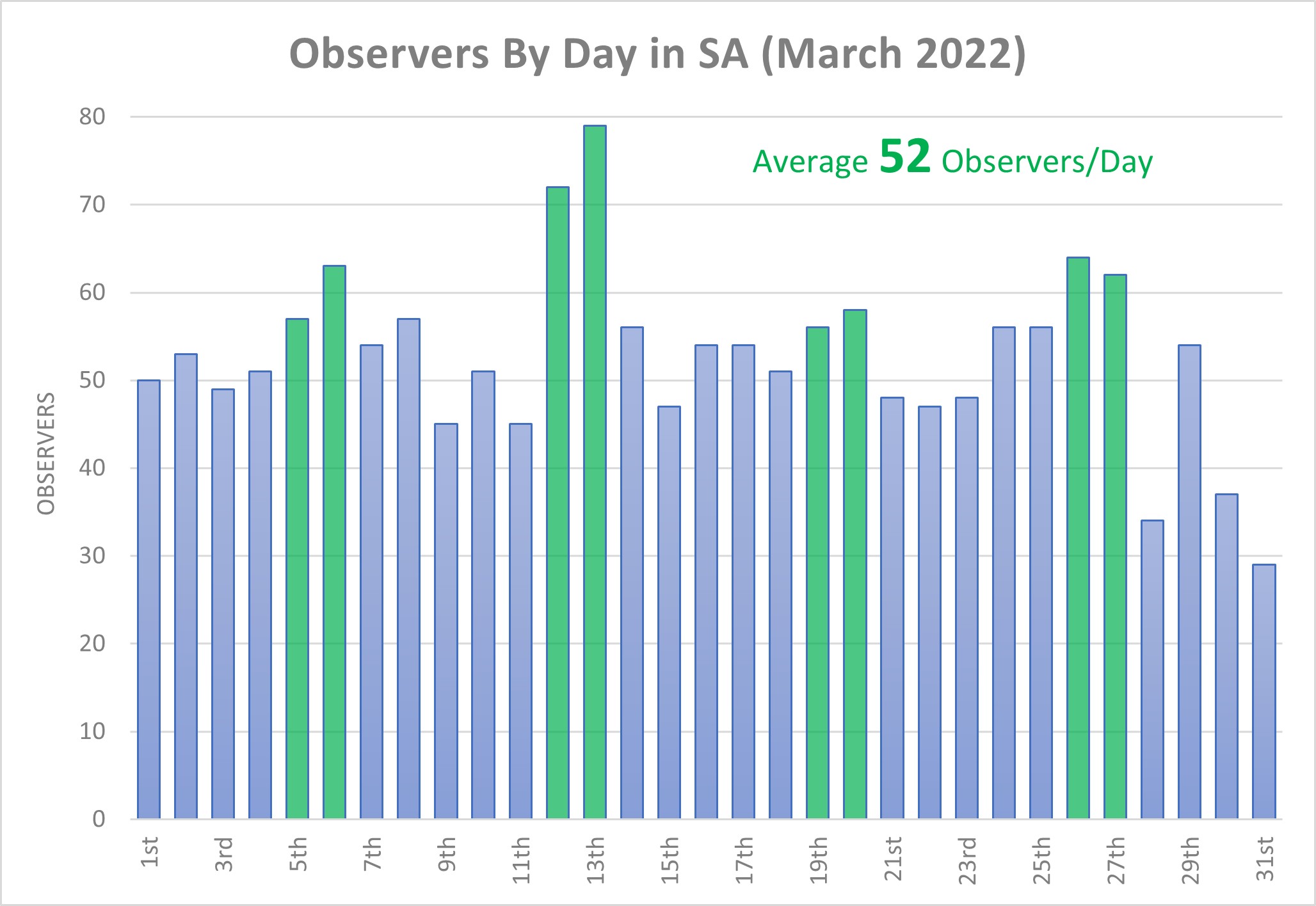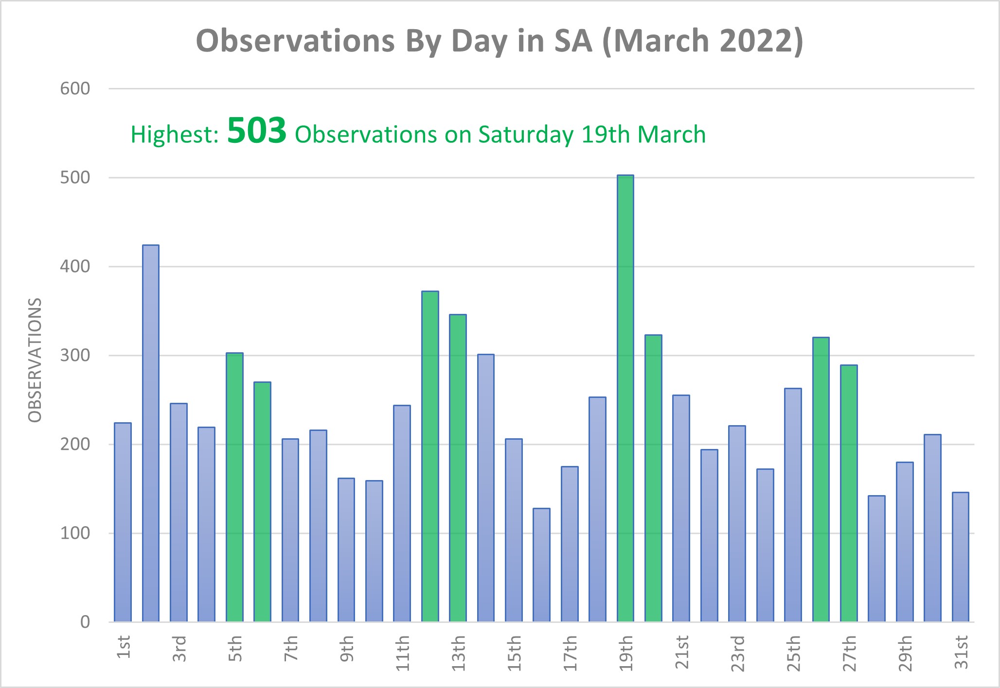 The number of observers in SA has exceeded 485 each month for the last 7 months, peaking during the Great Southern Bioblitz 2021 with 591 observers during the month. During this March there were an average of 52 people recording observations on any given day, peaking at 79 observers on the 13th. The highest number of observations in one day was 503 records on the 19th.
