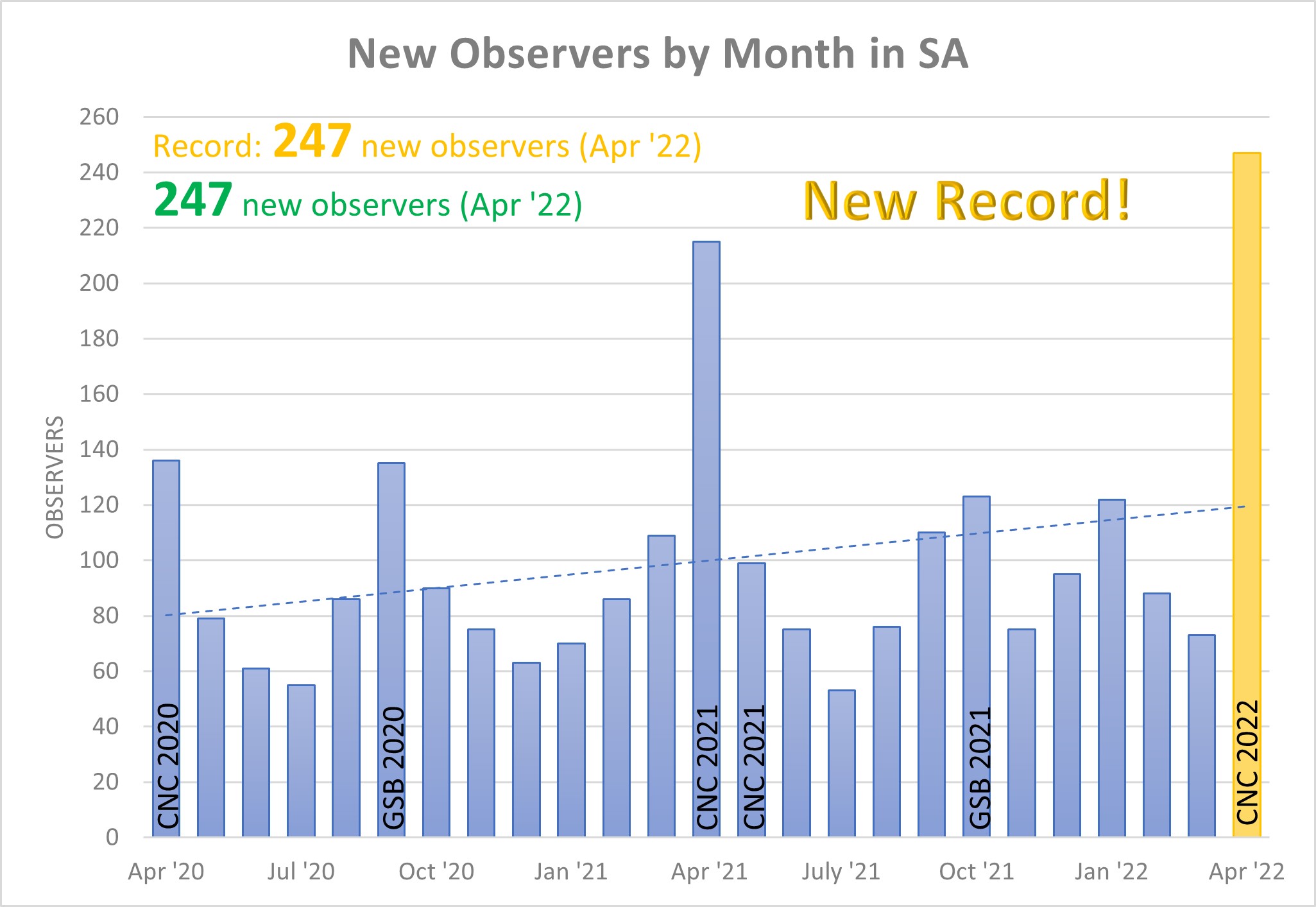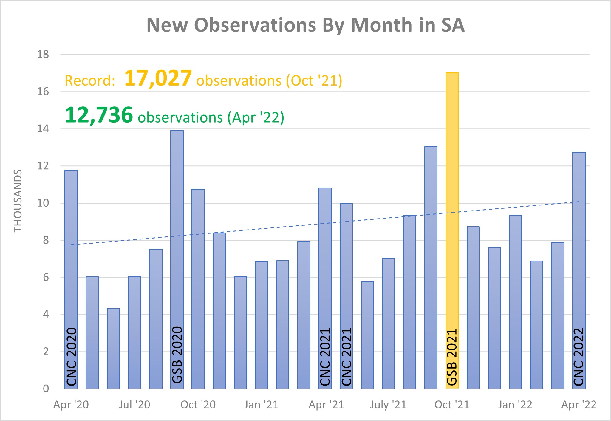 This April saw 12,736 observations covering 2,154 species from a total of 687 observers. A huge increase on the previous month thanks to the first two days of the City Nature Challenge 2022. There were 92 species receiving their first iNat record in SA. This month saw a record 247 new observers contributing their first observations in SA. Again due to the CNC, but also due to the second running of the Zoology II Backyard Arthropods project by the University of Adelaide. Upon this months observations, 631 identifiers contributed a total of 21,731 identifications.