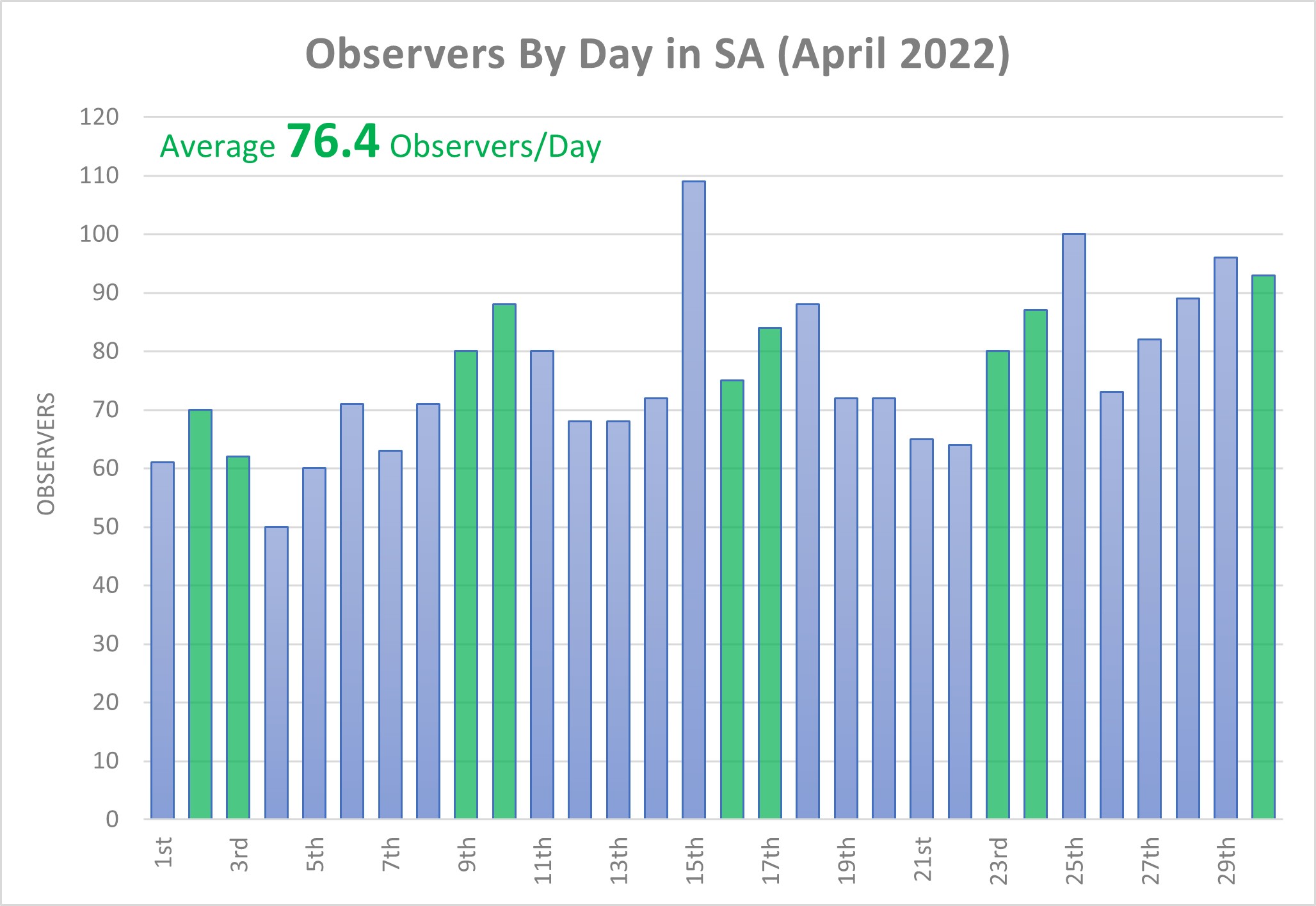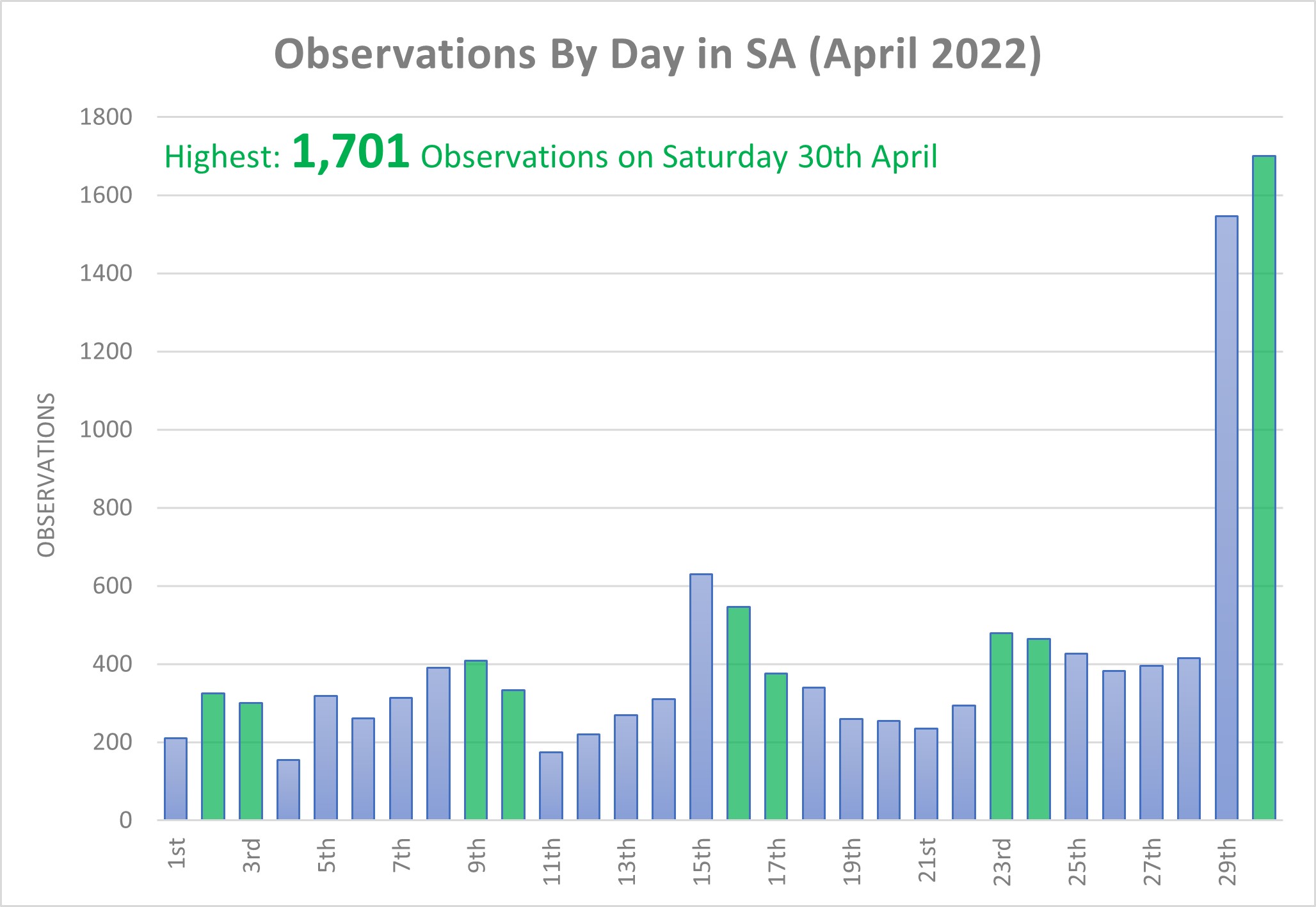 During April there were an average of 76 observers each day, peaking at 109 observers on Good Friday. The highest daily observations obviously aligned with the CNC, with 1,701 observations being made on Saturday 30th.