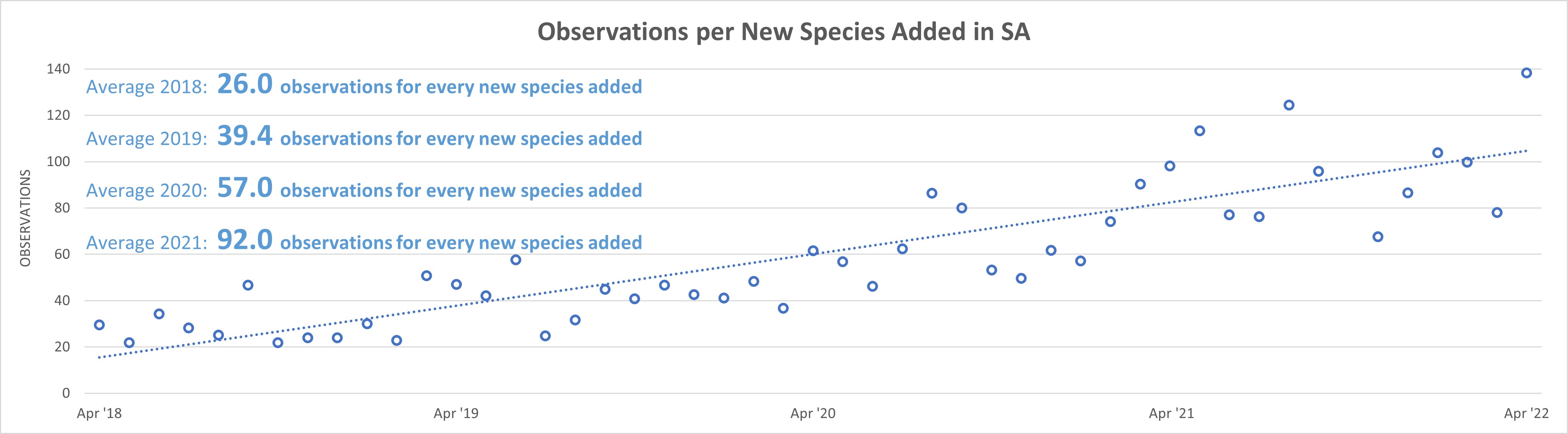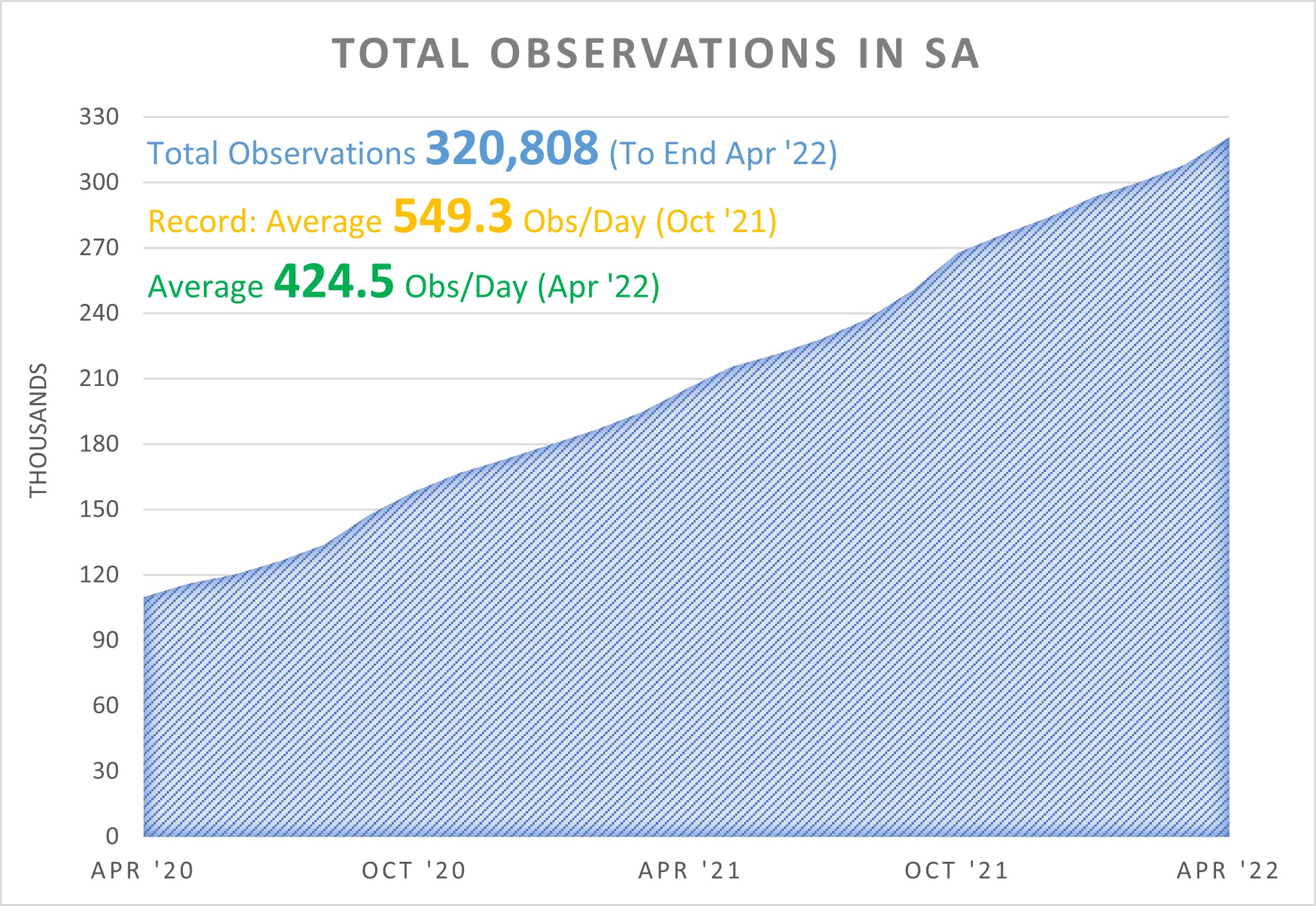 Uploads for SA at the end of April stand at 320,808 observations of 8,930 species from 4,631 observers with, as of today, 5,094 identifiers providing 587,544 identifications.