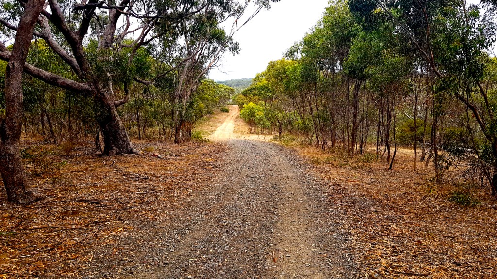 Breaking from the fire track and heading back along the Sundew Ridge Hike, the track runs along the side of a denuded hillside with views directly down to the Onkaparinga River.