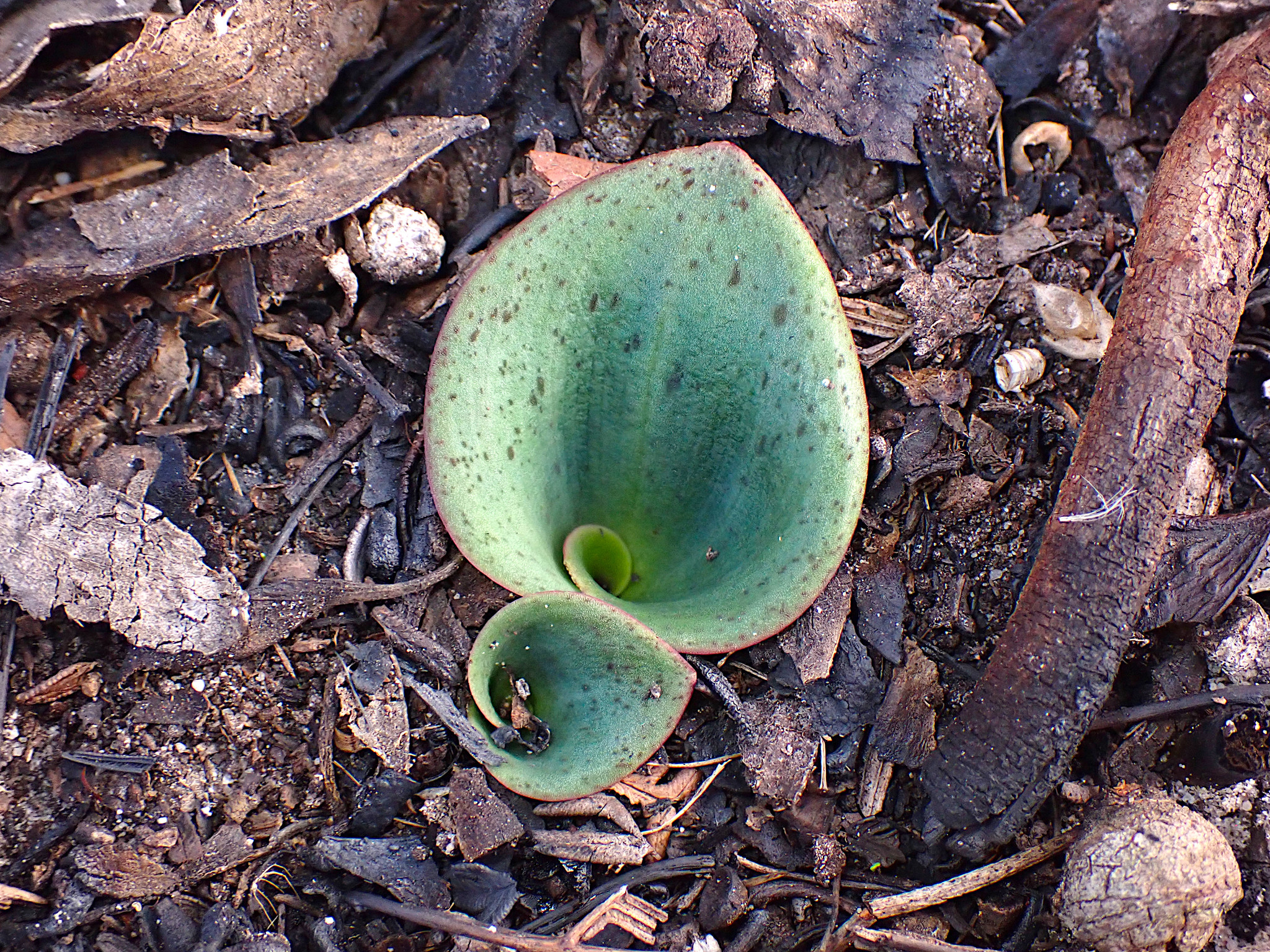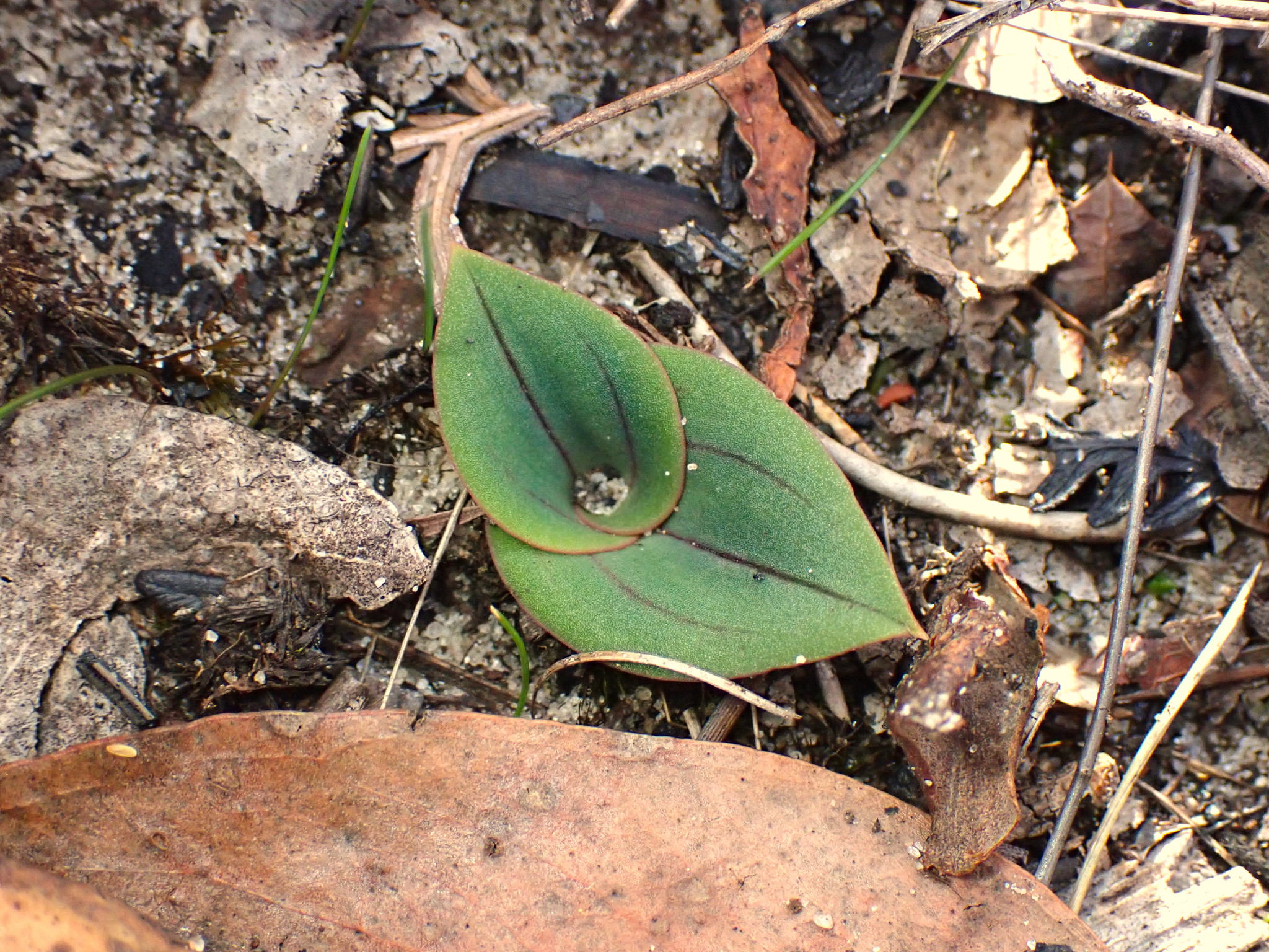 Along the border of the fire track some Greenhoods (Genus Pterostylis) had started putting up their leaves, possibly Maroonhoods (Pterostylis pedunculata) or Nodding Greenhoods (Pterostylis nutans) which I’ve sighted flowering here previously. Other Orchids were doing the same, include the Red Beaks (Pyrorchis nigricans) which might produce a good flowering display brought on by the fire. The Hare Orchids (Leporella fimbriata) were back, right in the middle of the fire track. Even when flowering these are tough to see unless you are specifically looking for them. It’s always worth keeping an eye on where you are stepping when walking through these parks.
