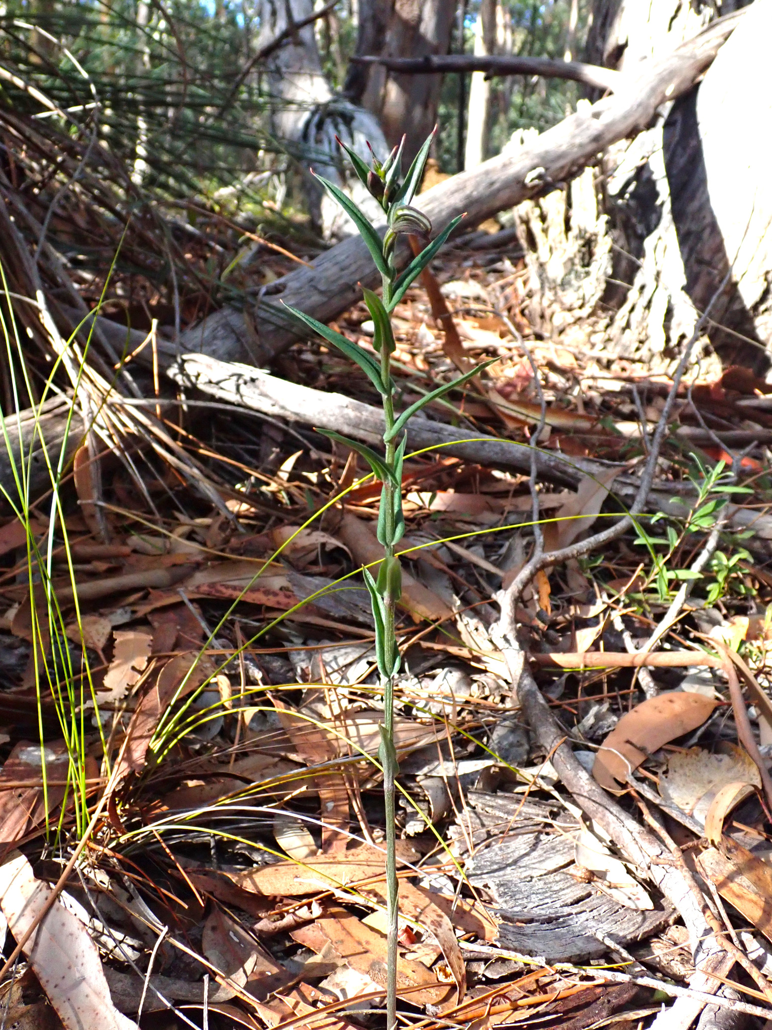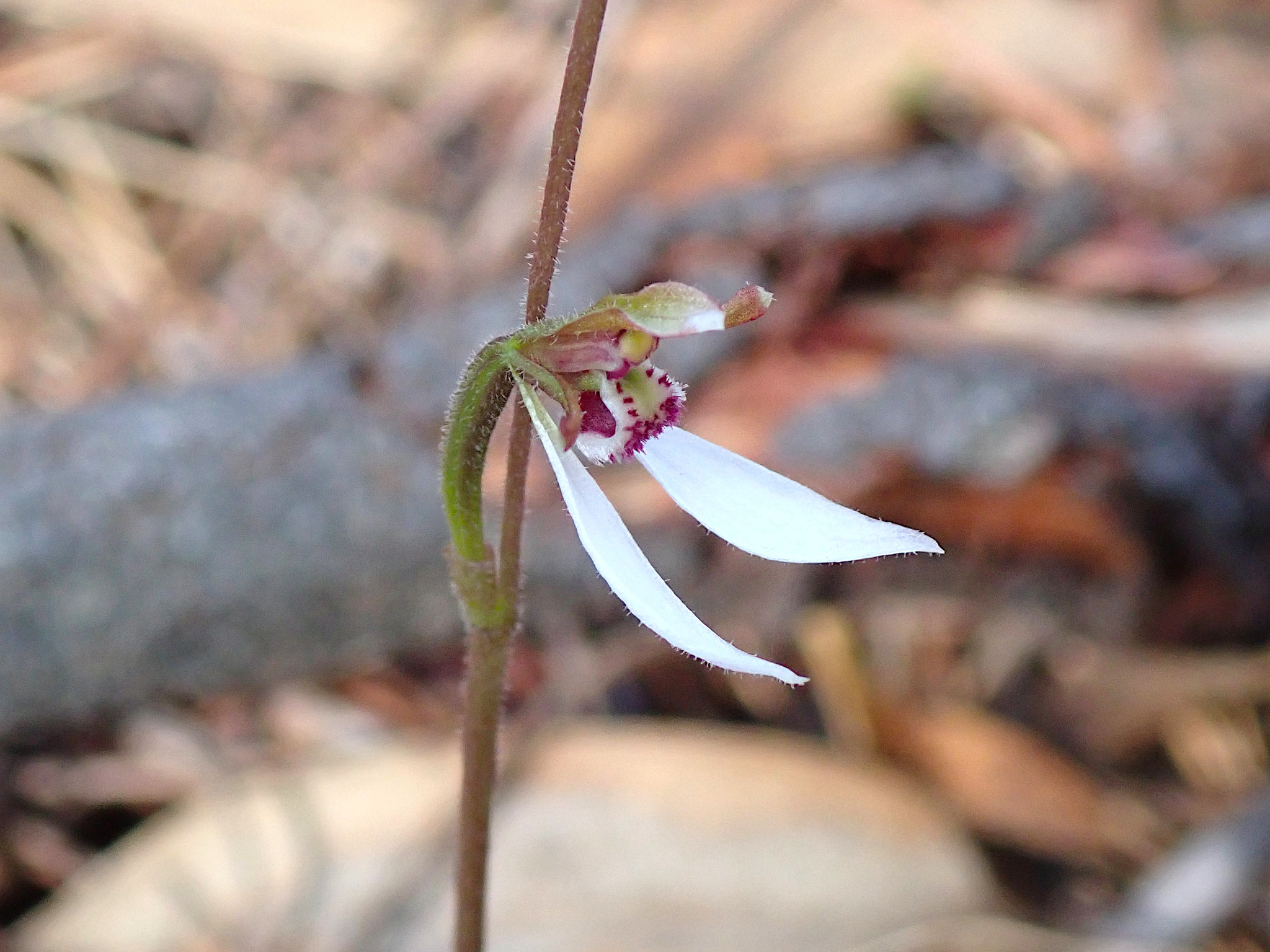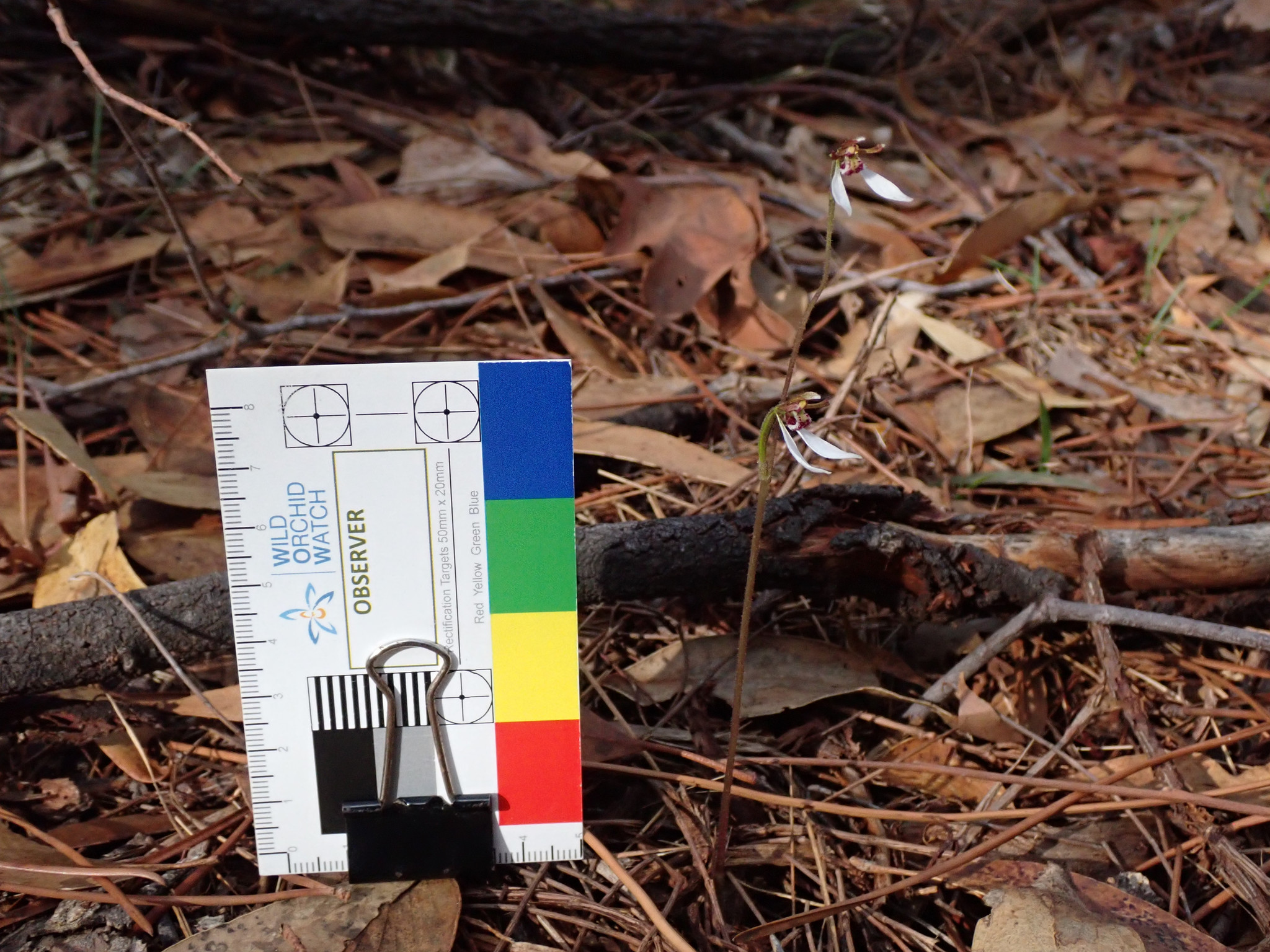 Along the edge of the track I spotted a small patch of Red-banded Greenhoods (Pterostylis sanguinea). Four in total over a few square metres with one beginning to flower. A little further along another patch of two. For both of these I took note of the number growing, the surrounds, and took pictures of the area around the Orchids, and above, and added the observations to the Wild Orchid Watch Australia iNaturalist project. Further down the track I was surprised to find a single double-headed Parson’s Band Orchid (Eriochilus collinus).