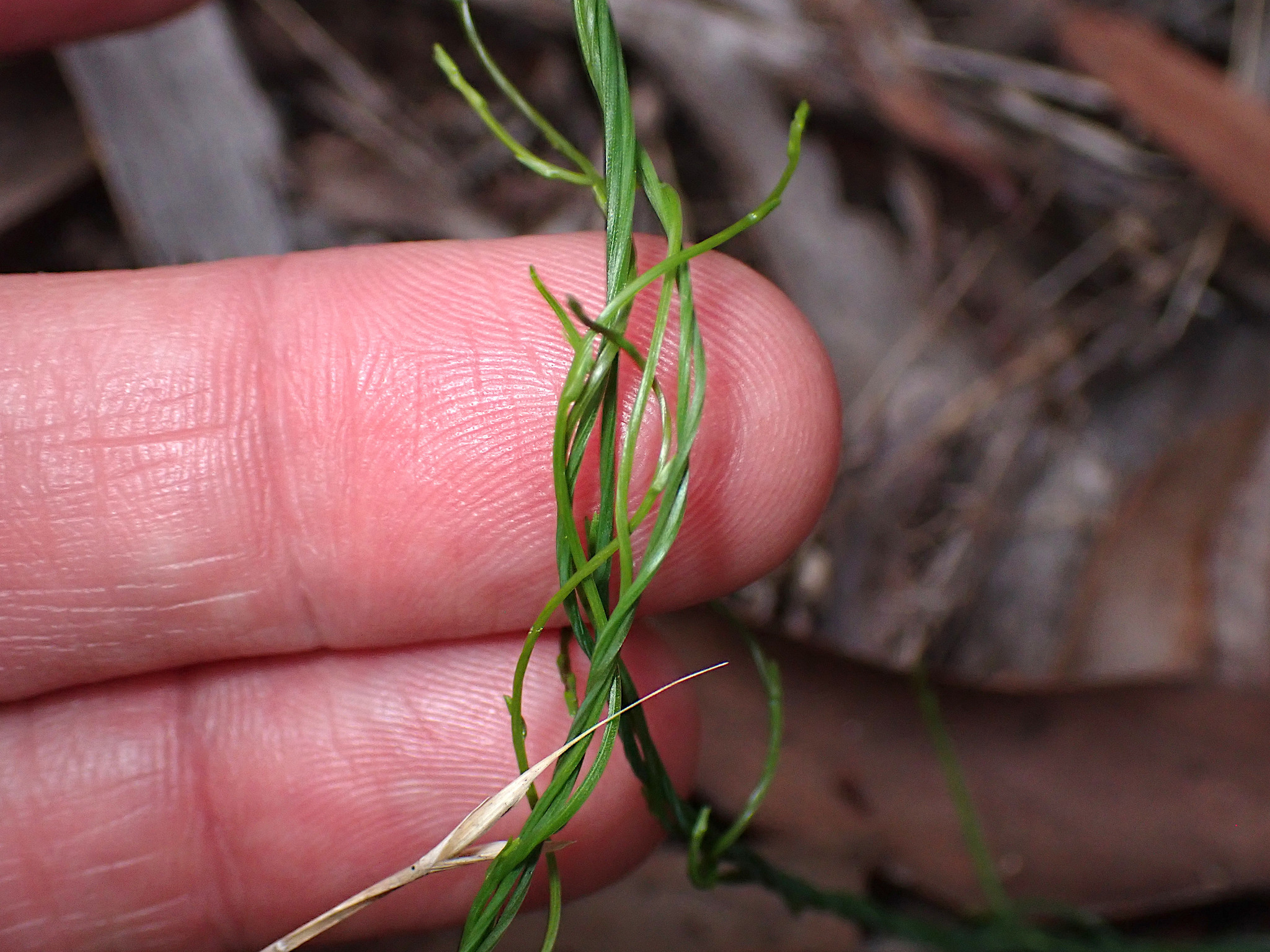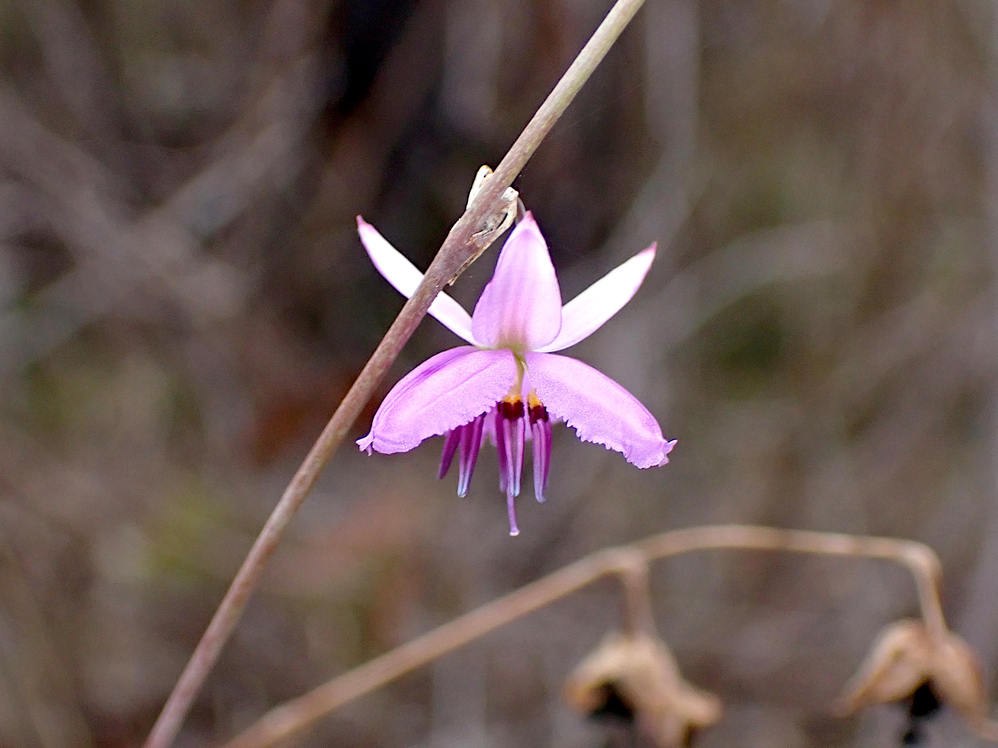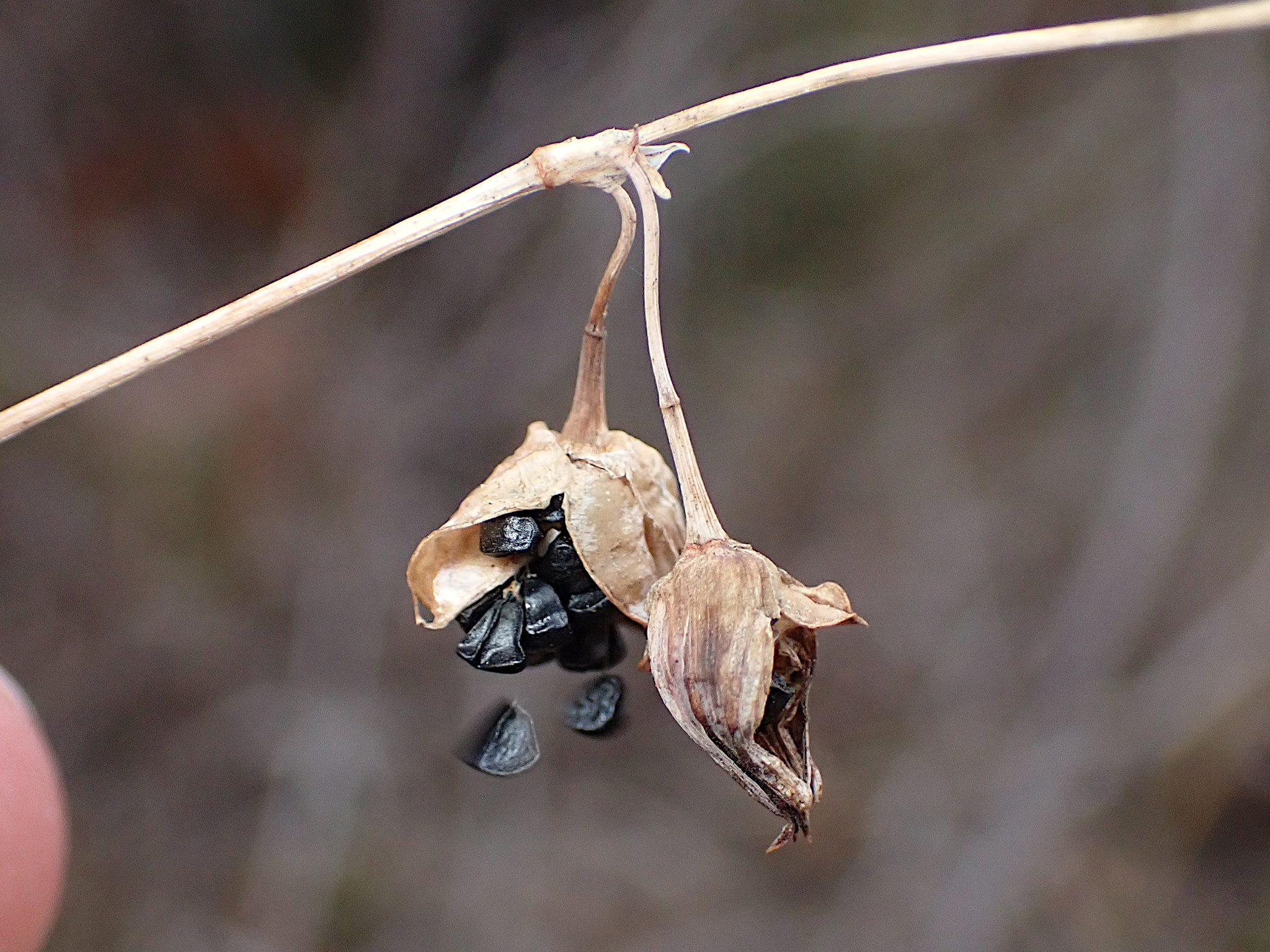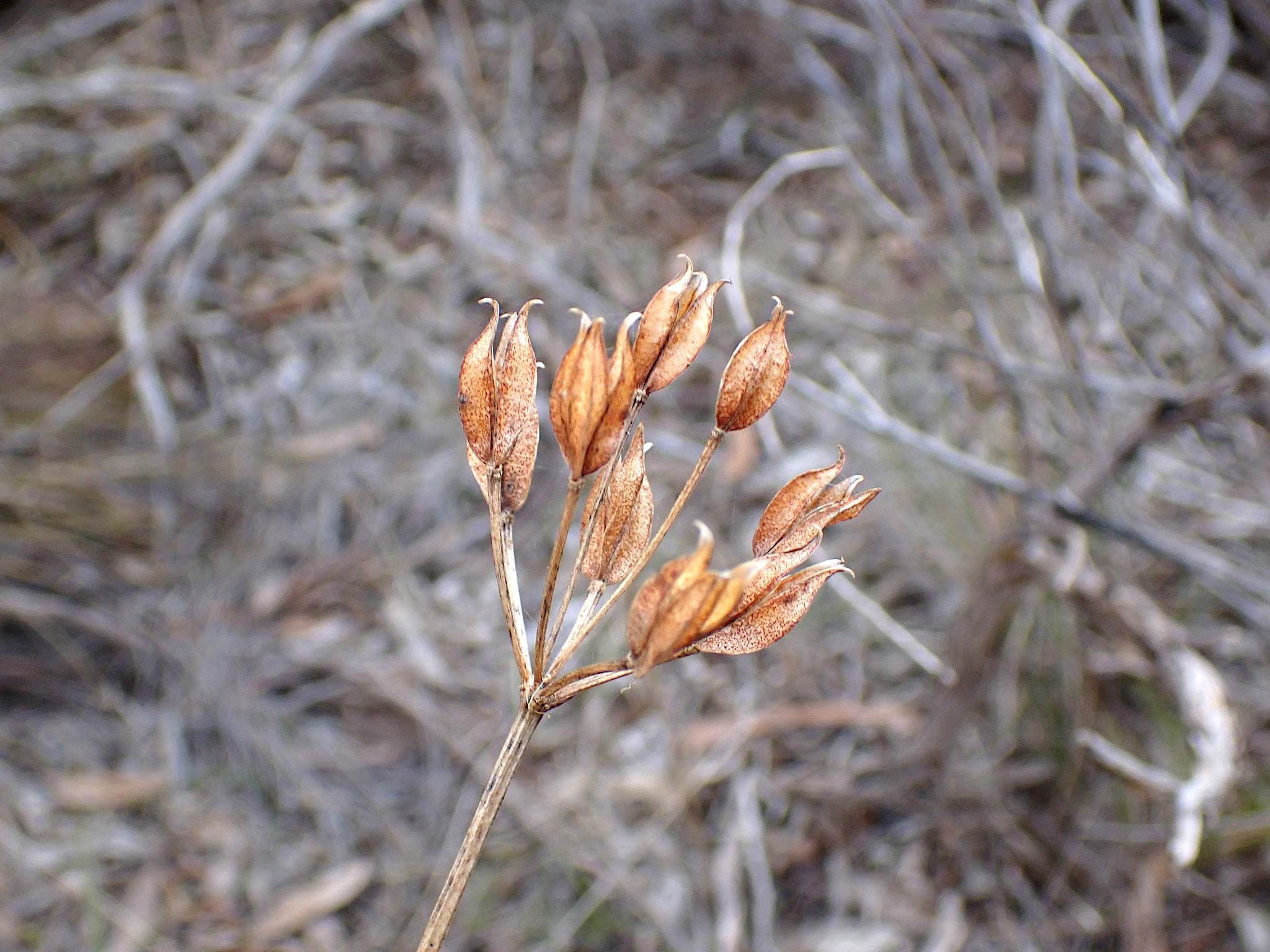 This time of year identifying some species requires knowledge of either what dried seed pods look like, or be able to recognise the first shoots emerging now the rainy season is beginning. The finished flower stalk and empty fruit capsules of Milkmaids (Burchardia umbellata) are easy to ID, due to the way the stalk branches. The tall flower stalk of the Nodding Chocolate Lily (Arthropodium fimbriatum) is also quite distinct. It can be separated from the stalk of the Common Chocolate-lily (Arthropodium strictum) in that the flowers occur in groups of 2 to 4 emerging from the same axil.