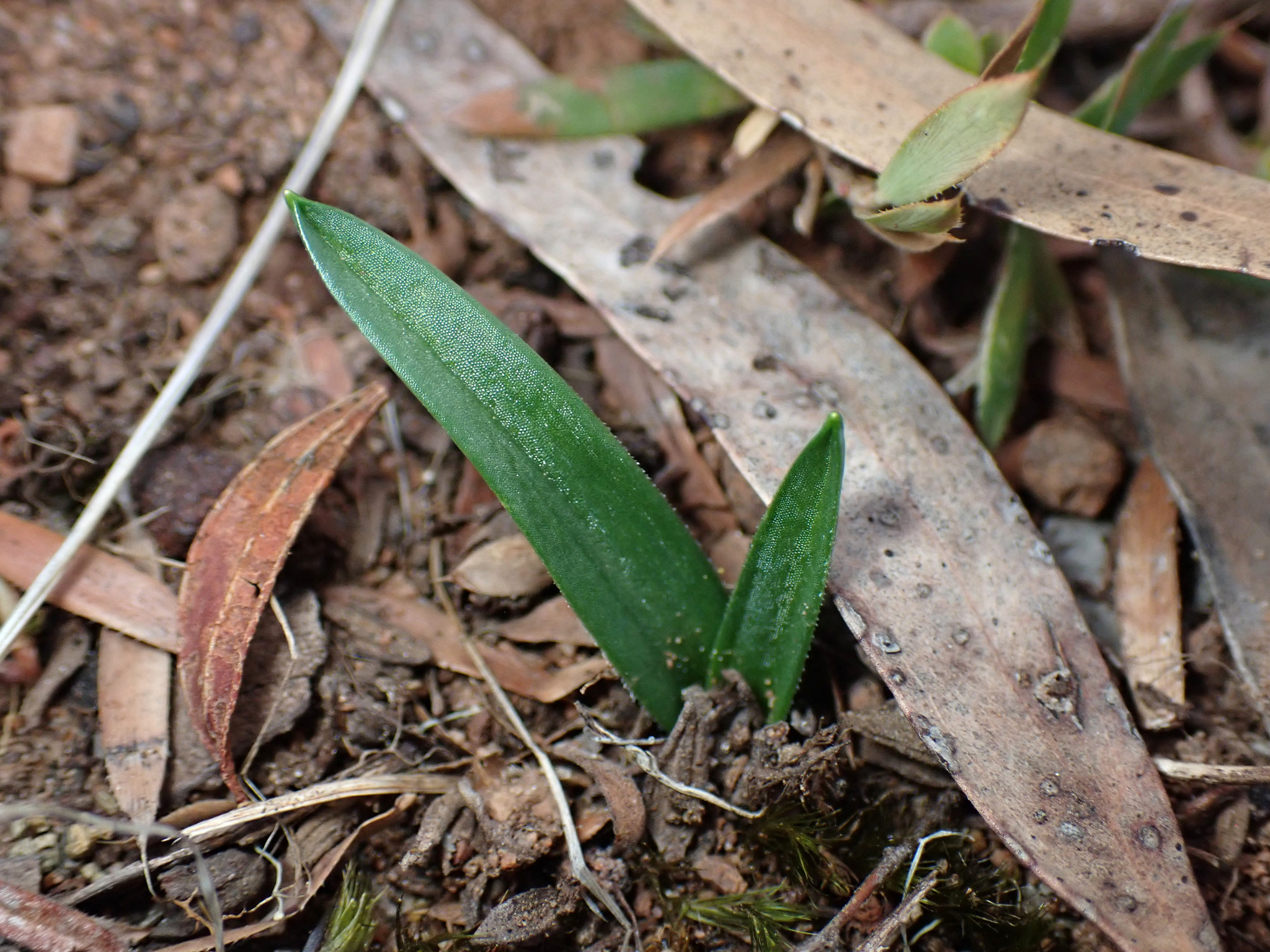 The emerging Fringe-Lilies are easy to recognise from their twining branches, with the Twining Fringe-Lily (Thysanotus patersonii) most common at this location. Also emerging are the leaves of the Blue Stars (Chamaescilla corymbosa), which I used to mistake for Orchids, and can be separated in that they have multiple emerging leaves, whereas the local similar looking Orchids have a single leaf at this stage.
