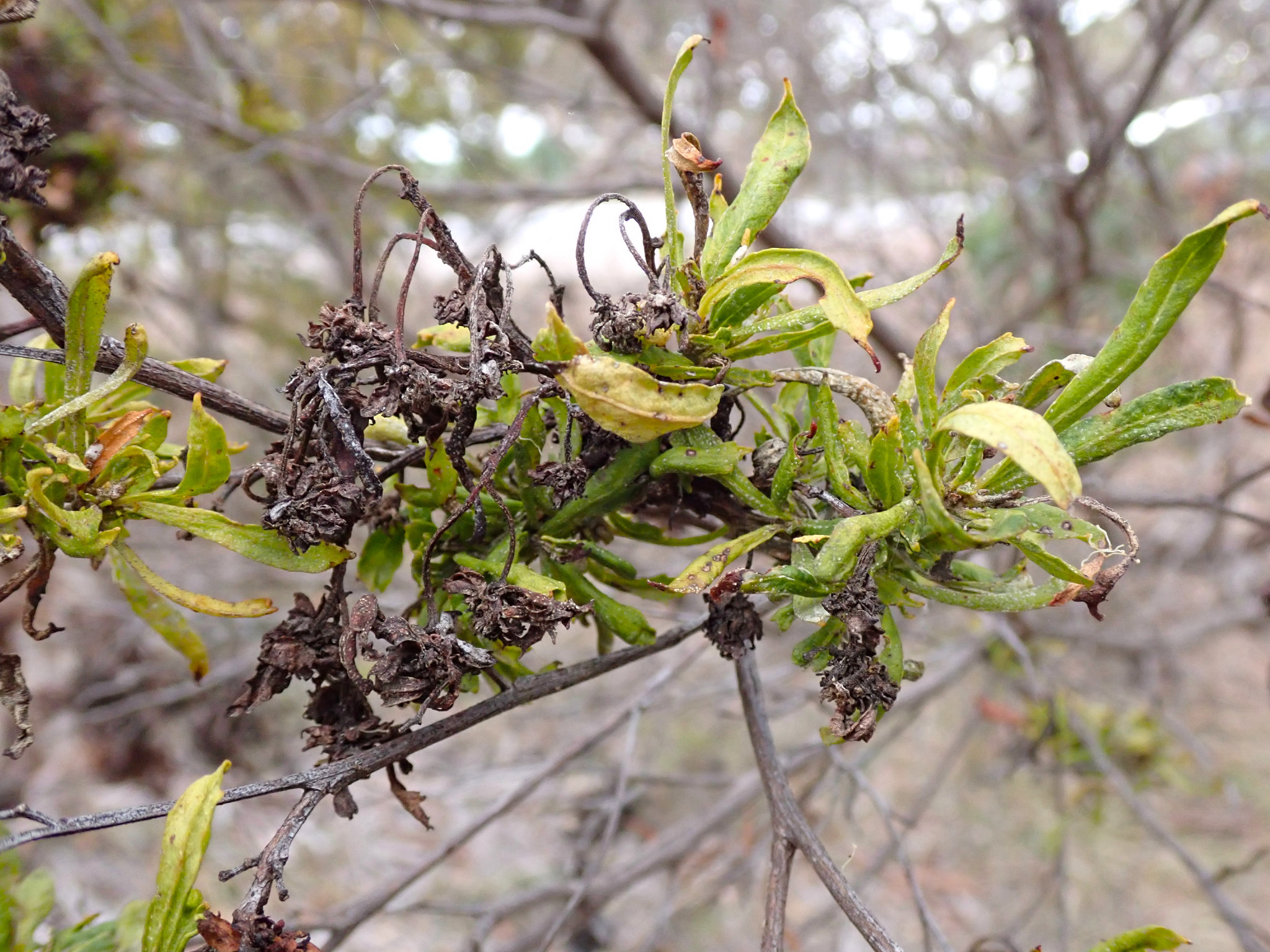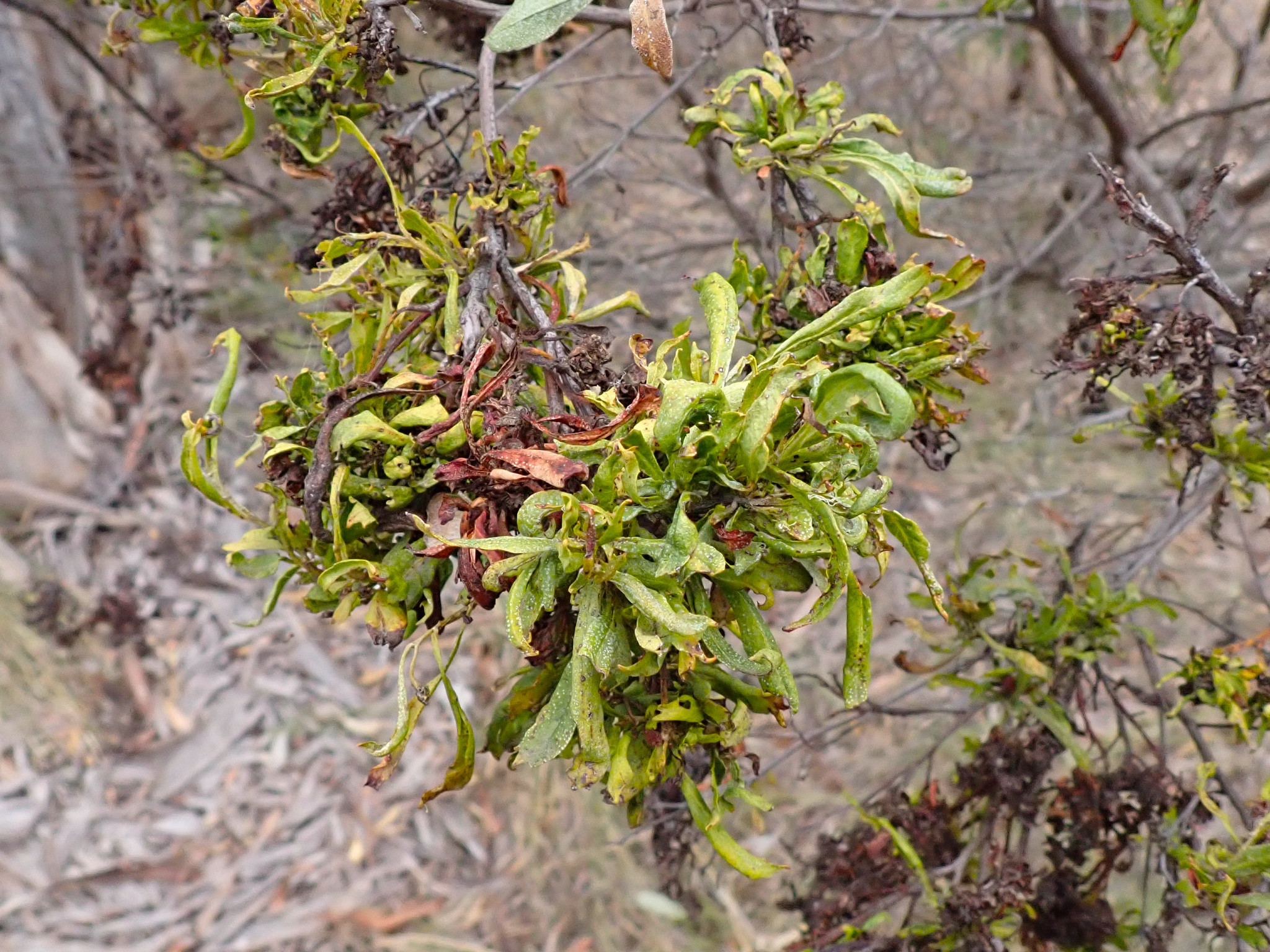 First record was an abnormal growth on a Sticky Hop-Bush (Dodonaea viscosa). These growths are quite common with many plants showing at least one patch, and some with dozens. The growth is potentially caused by a Phytoplasma (Genus Phytoplasma). These small genome Bacteria are obligate intracellular parasites of plant phloem tissue, transmitted by sap-sucking Insects. I’ve never noticed any particular Hemiptera associated with these Dodonaeas, but it might be worth taking a closer look. The literature suggests that multiple Hemiptera species are involved, but it seems likely there is a primary transmitter in each area or region. If that’s the case I should be able to find a particular species of Bug on multiple Hop-Bushes.