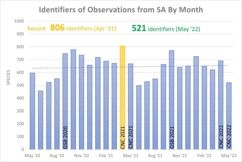 This May saw 8,137 observations covering 1,726 species from a total of 494 observers. This extended wet weather has really put a damper on observations. There were 66 species receiving their first iNat record in SA. This month saw a record 90 new observers contributing their first observations in SA. Upon this months observations, 521 identifiers contributed a total of 14,199 identifications.