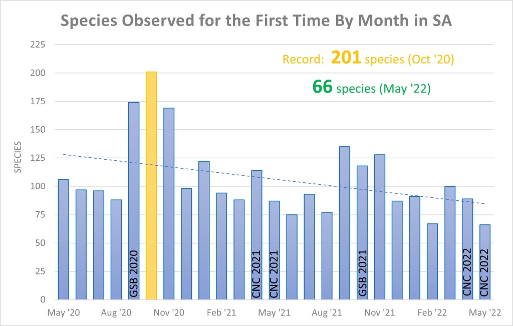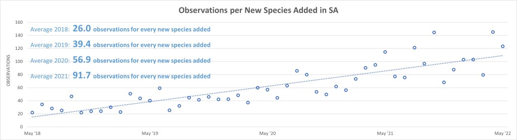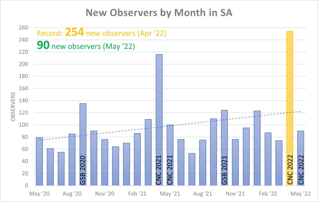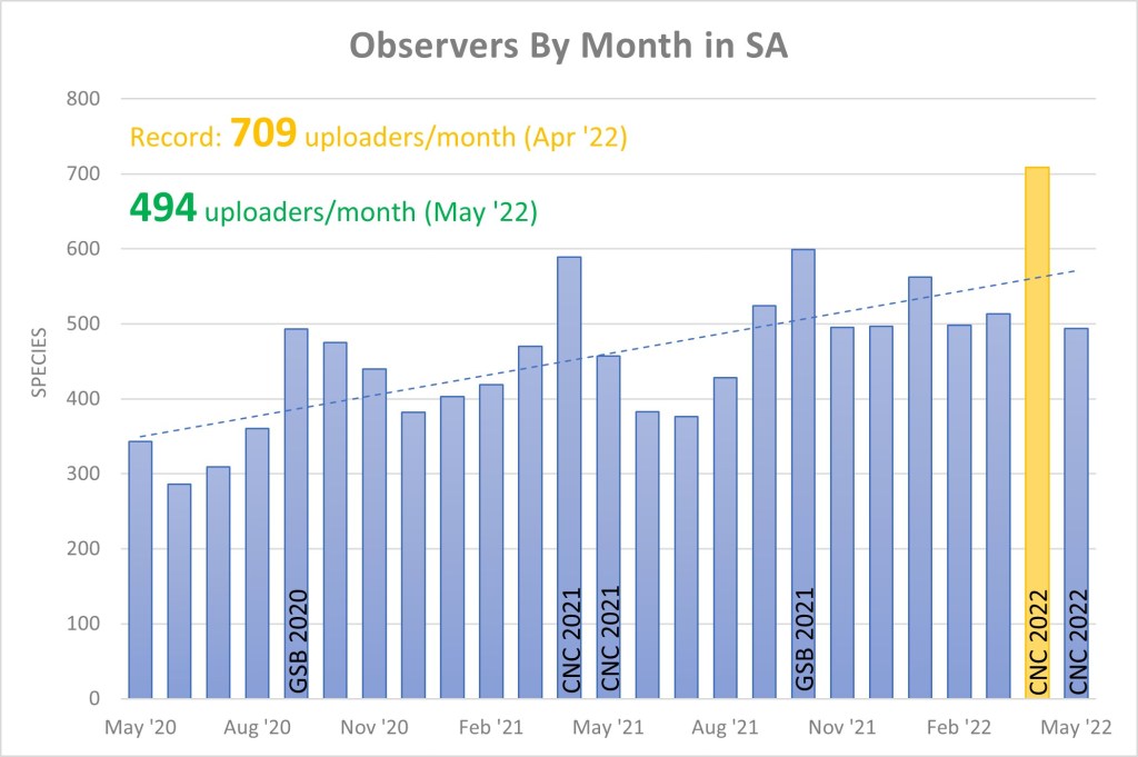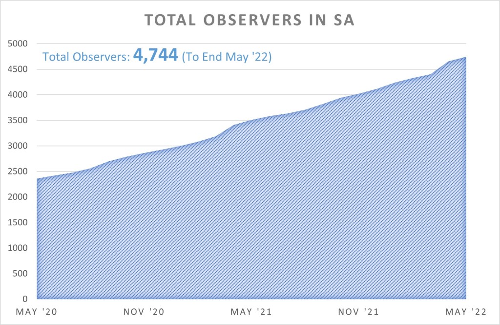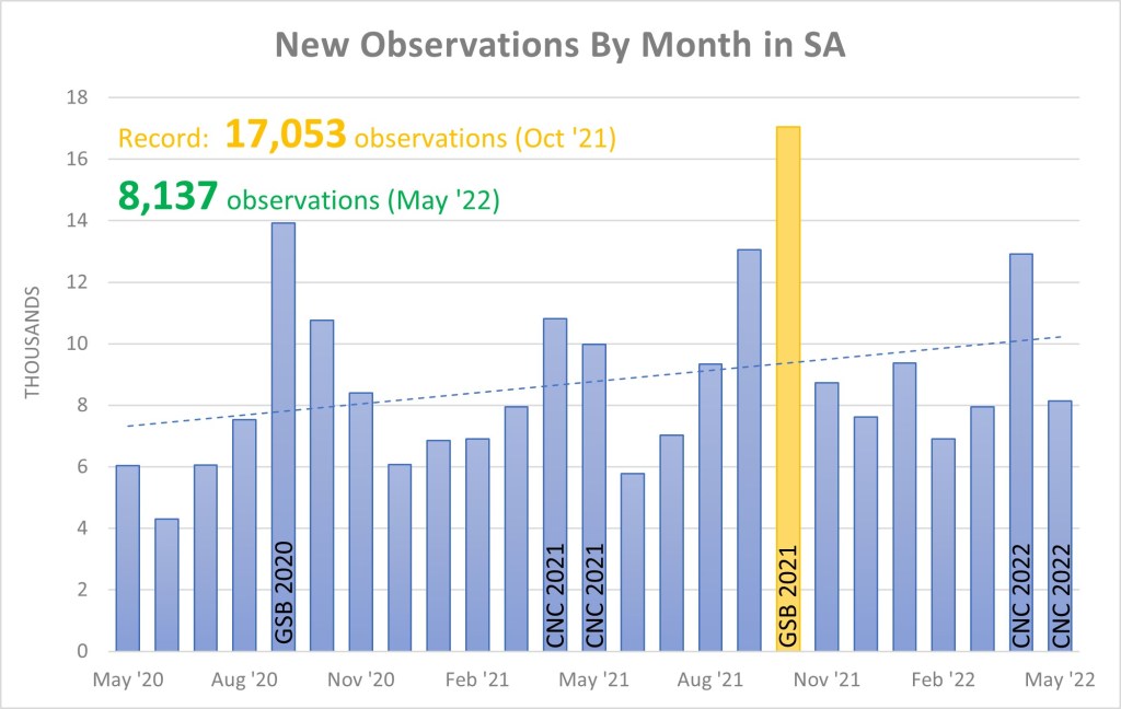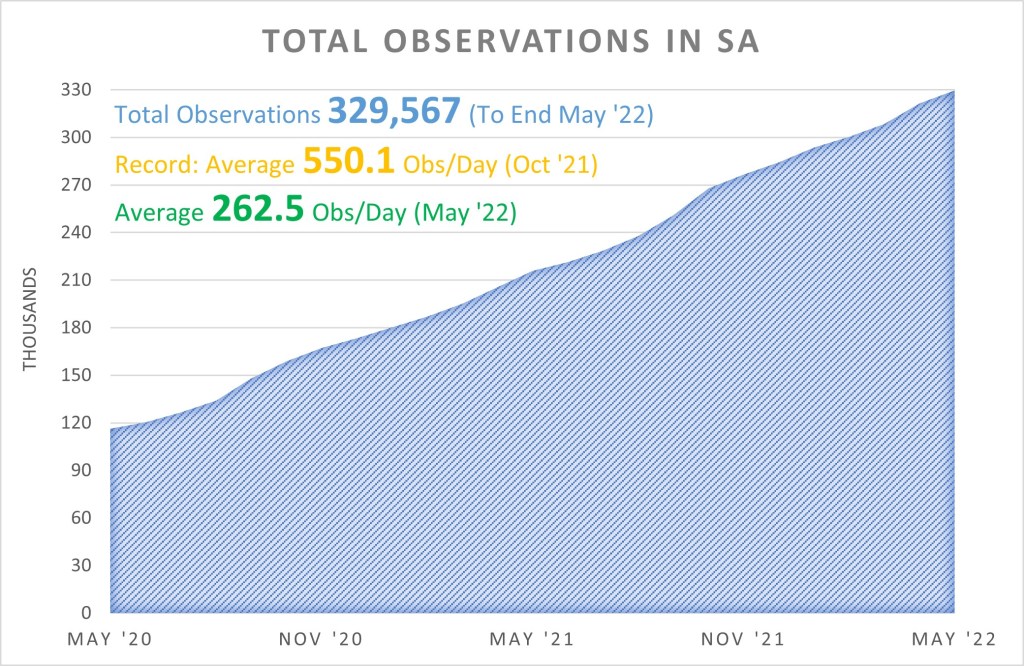 Uploads for SA at the end of May stand at 329,567 observations of 9,013 species from 4,744 observers with, as of today, 5,214 identifiers providing 601,804 identifications.