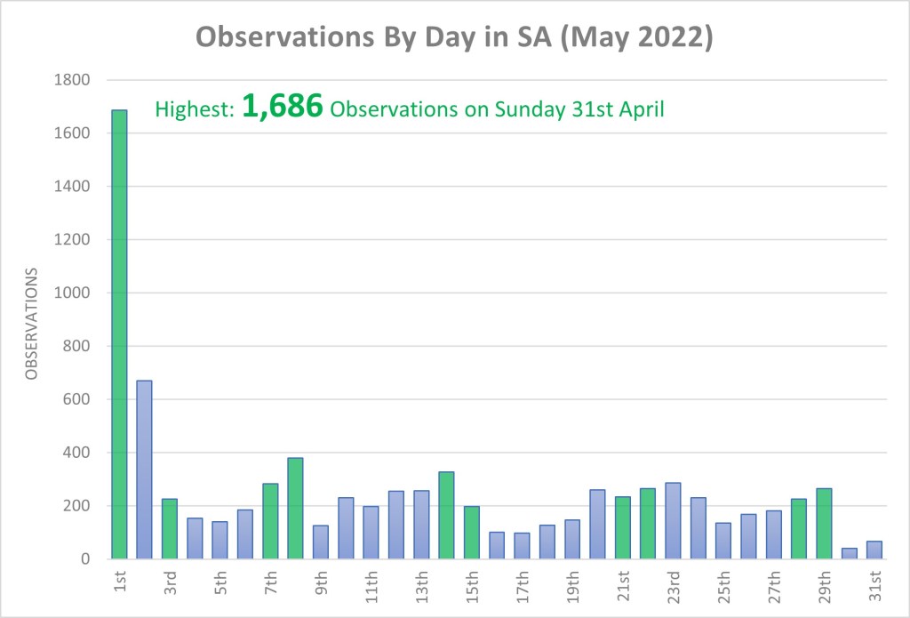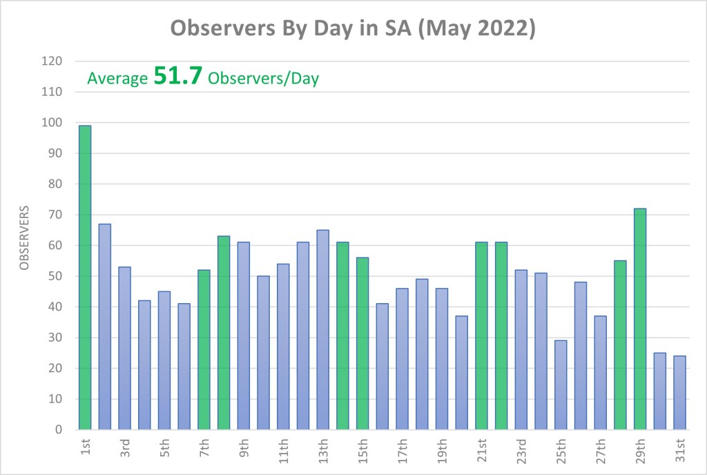 During May there were an average of 51 observers each day, peaking at 99 observers on the City Nature Challenge Sunday. The highest daily observations again aligned with the CNC, with 1,686 observations being made on Sunday 1st.