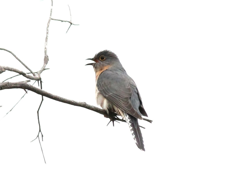 Perched at the top of a dead Eucalyptus trunk I spotted and Fan-tailed Cuckoo (Cacomantis flabelliformis). It hung around for a few minutes periodically calling. A couple of White-browed Scrubwrens (Sericornis frontalis) had also spotted the Cuckoo and were rather unhappy about its presence.