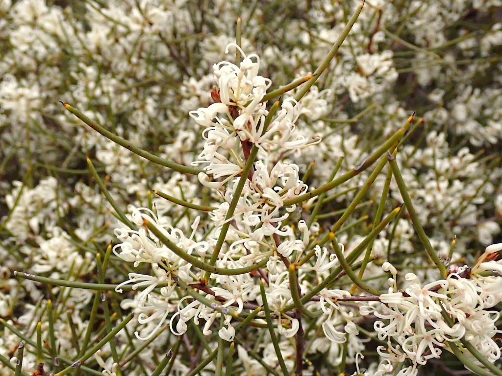 Along the fence line were a few large Beaked Hakeas (Hakea rostrata) in full flower. One of these I spotted at Hardy’s Scrub recently was awash with Insect life, especially native Bees, once the morning sun had warmed it enough. This morning however was too cold and the only species I found on it was the Honey Bee (Apis mellifera). These introduced Bees can forage in temperatures 12-15°C, whereas many of our native Bees need a few degrees warmer before they can forage. Amongst the thicket of old shrubs and Hakeas along the fence, several Superb Fairywrens (Malurus cyaneus) were flitting about showing beginnings of breeding plumage.